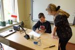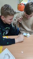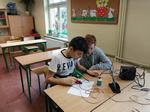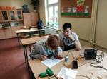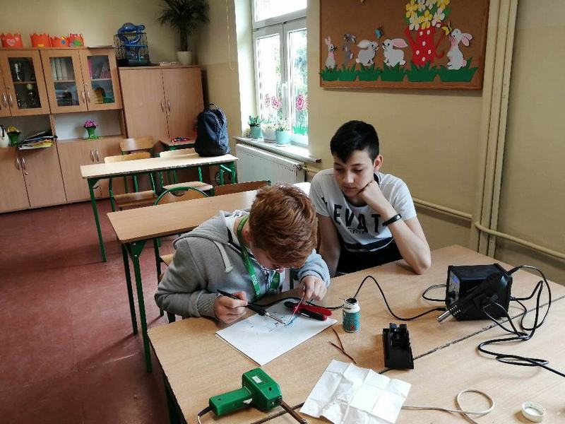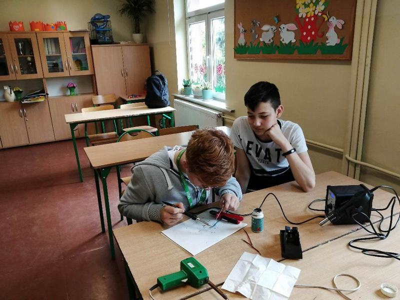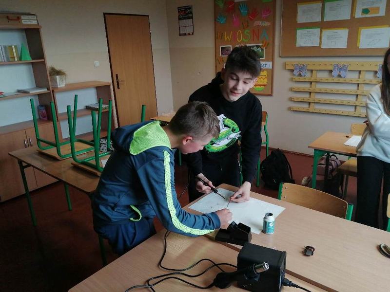 Uczniowie klasy V skorzystali z okazji, aby kilkukrotnie doskonalić swoje umiejętności posługiwania się stacją lutowniczą. Zajęcia zostały poprzedzone krótkim szkoleniem BHP, bo tego wymagała specyfika zajęć. Praca dotyczyła umiejętności: