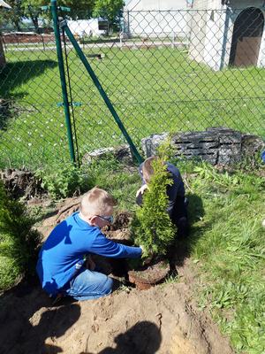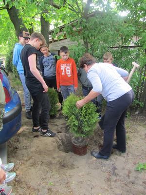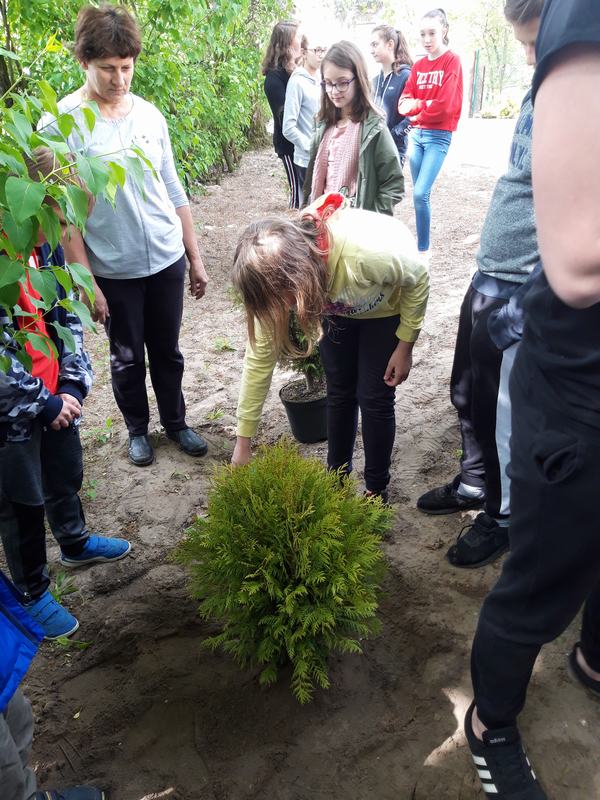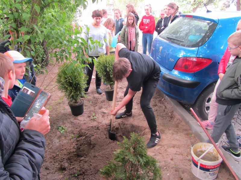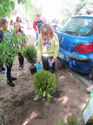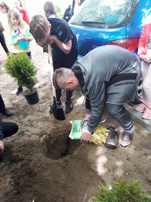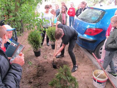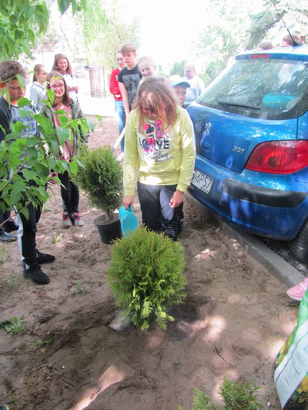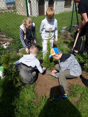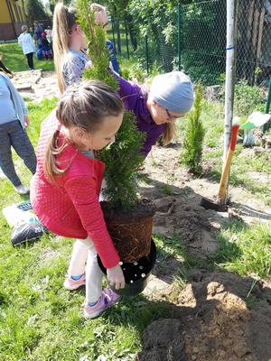 W czwartek dzieci wraz z wychowawcami zasadziły na terenie szkoły drzewa i krzewy, zakupione z klasowych funduszy iglaki oraz podarowane przez Stowarzyszenie Ekologiczno Kulturalne EKOklub w Wielowsi lipy. Sadzenie drzew i krzewów przypomniało wszystkim o odpowiedzialności za naszą planetę. Rośliny będą nie tylko ozdobą, "filtrem" powietrza przy naszej szkole, ale również obiektem przyrodniczych obserwacji.