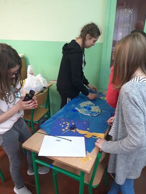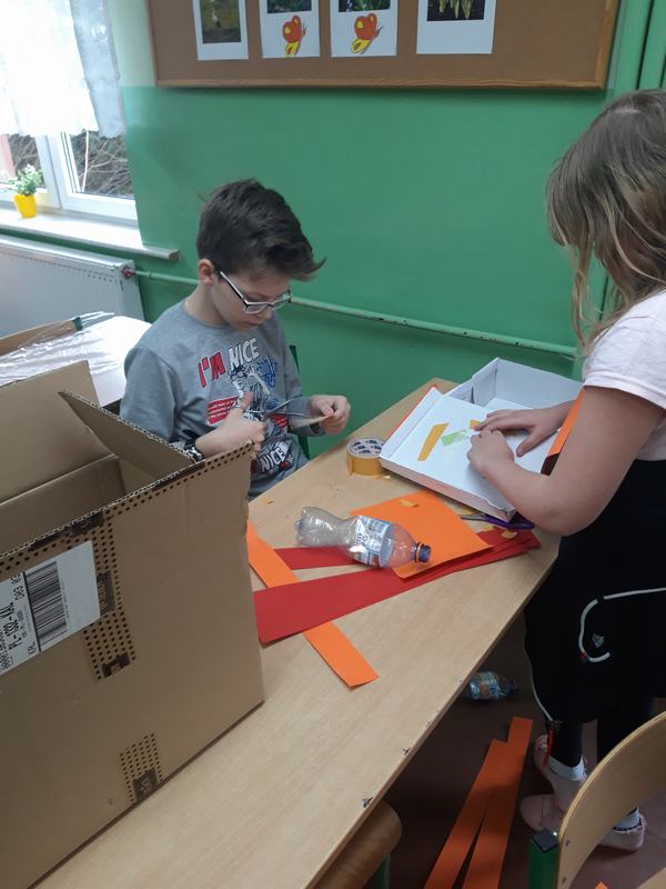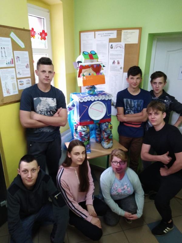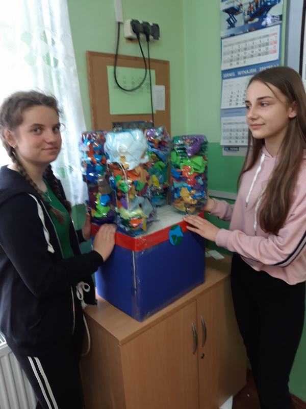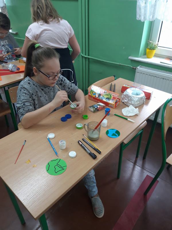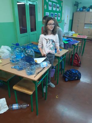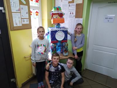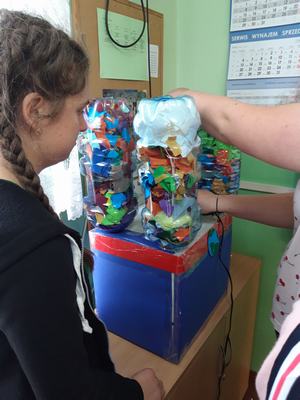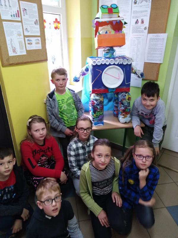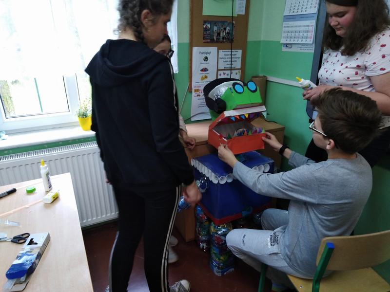 Zwieńczeniem działań podjętych w ciągu "Tygodnia dla Ziemi" było wykonanie "Połykacza śmieci". Do wykonania zadania wykorzystane zostały materiały przeznaczone do recyklingu, czyli pudełka różnej wielkości, kartony, kolorowe gazety, folie, plastikowe butelki i zakrętki. Każdy miał możliwość pofantazjowania. W rezultacie powstał stwór, którego zadaniem jest połykanie wszystkich odpadów. Śmieciożer, bo takie otrzymał imię, strzeże porządku na naszym szkolnym korytarzu.