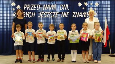 20 czerwca 2024 roku odbyło się uroczyste zakończenie roku szkolnego w przedszkolu oraz pożegnanie dzieci kończących edukację przedszkolną. Pani dyrektor Bożena Małecka powitała przybyłych rodziców i dzieci. Następnie przedszkolaki zaprezentowały okolicznościowy program artystyczny. Po nim przyszedł czas na wręczenie pamiątkowych dyplomów i książek zakupionych z funduszu Rady Rodziców. Pani dyrektor podziękowała rodzicom za współpracę, za wszelkie działania wspierające przedszkole, za zrozumienie oraz zaangażowanie.