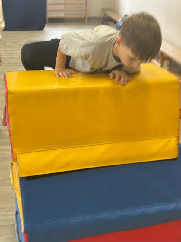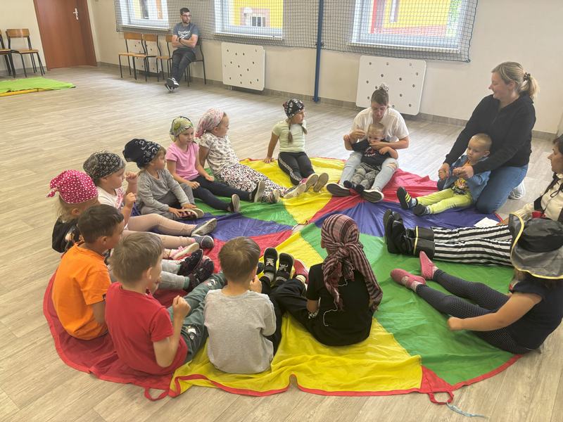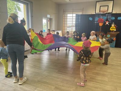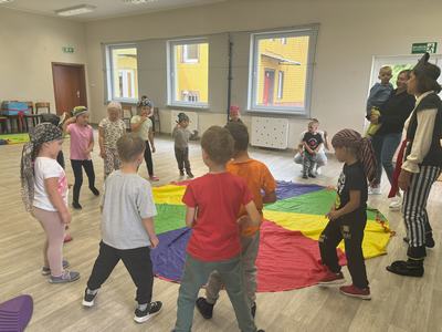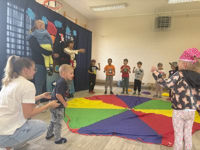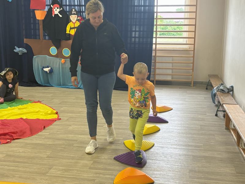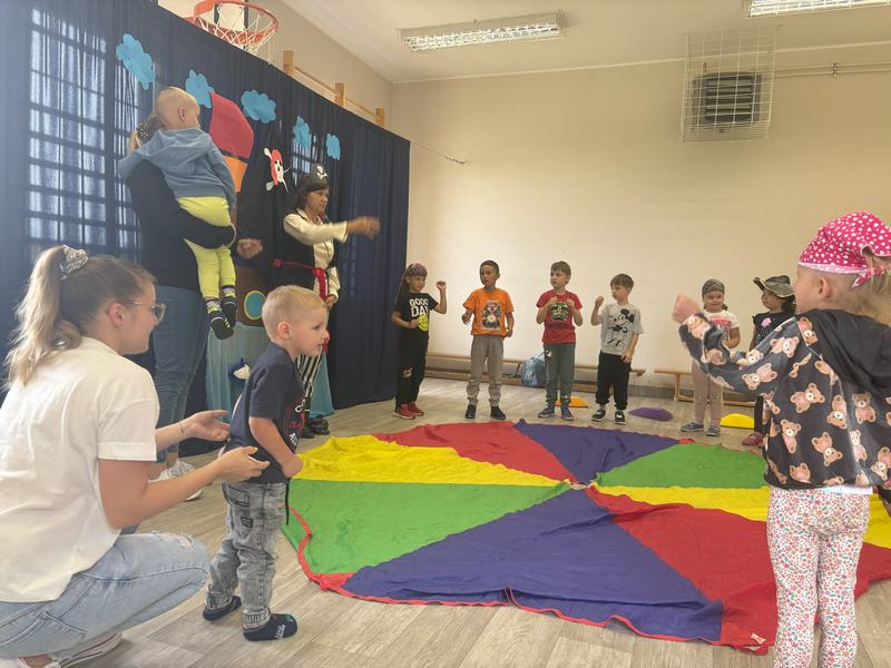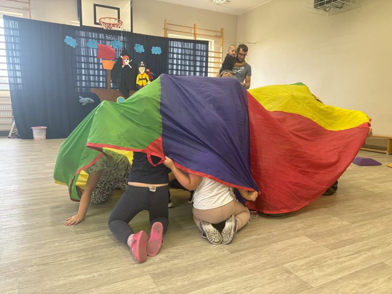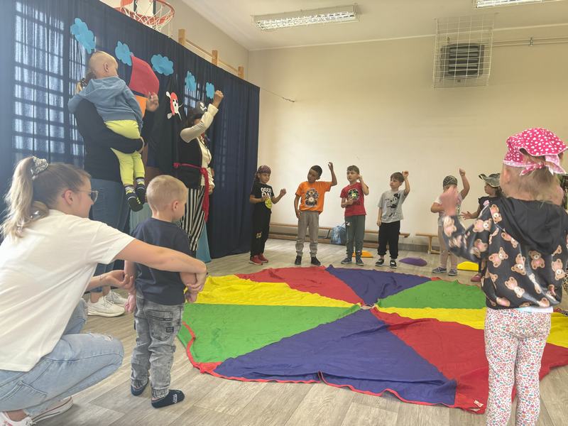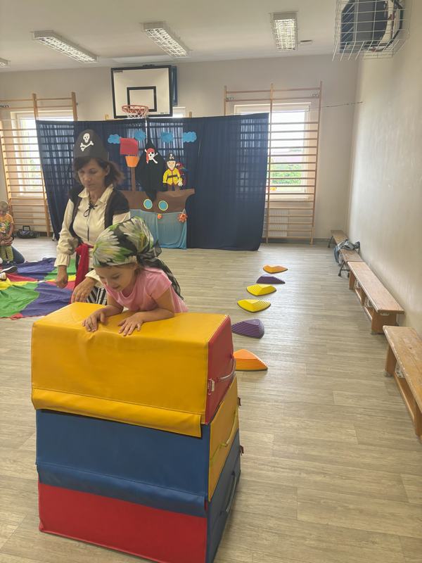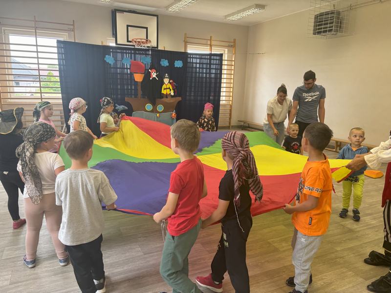 Następnie wspólnymi siłami został przetransportowany na chustę animacyjną, która służyła za pokład statku.