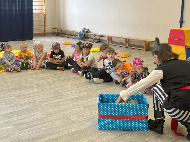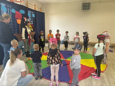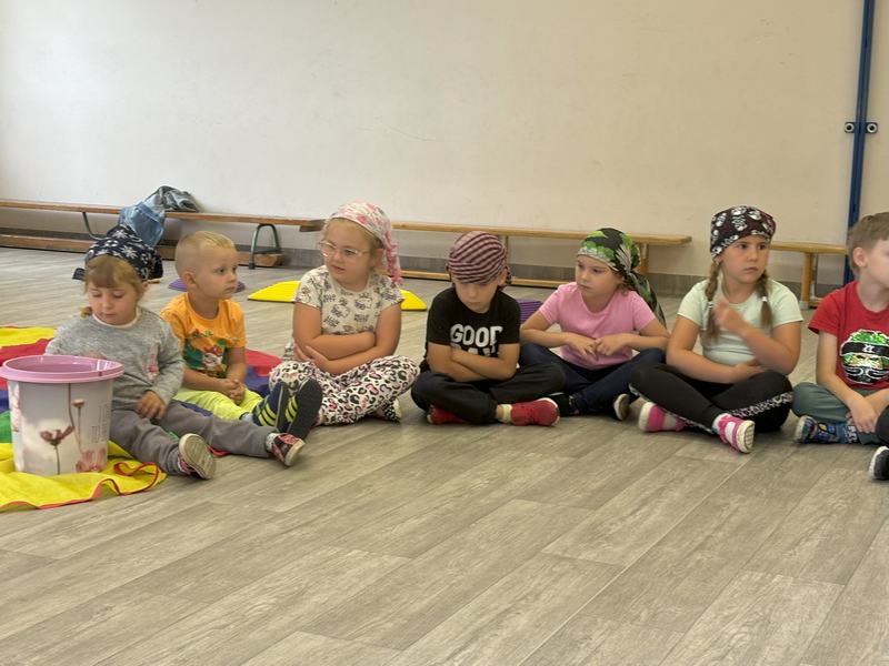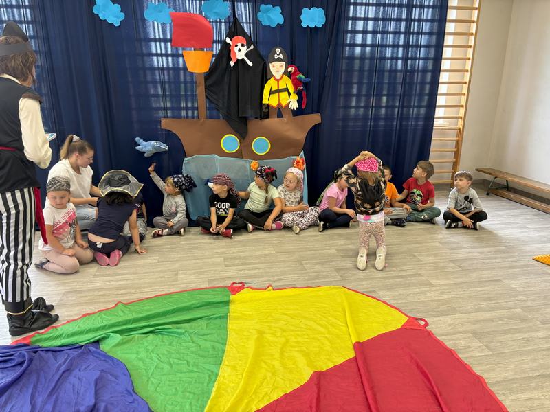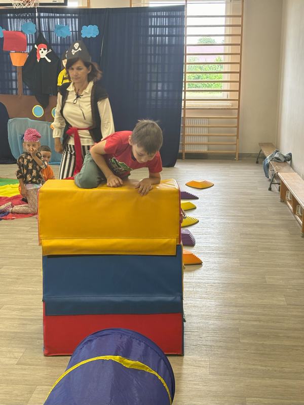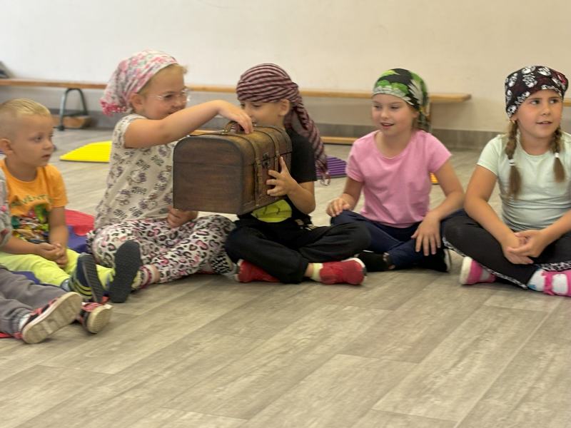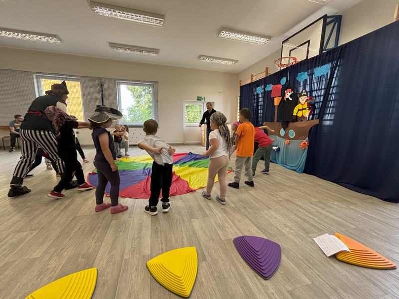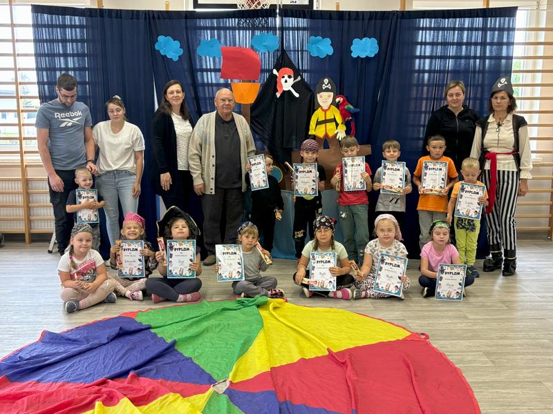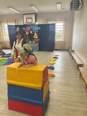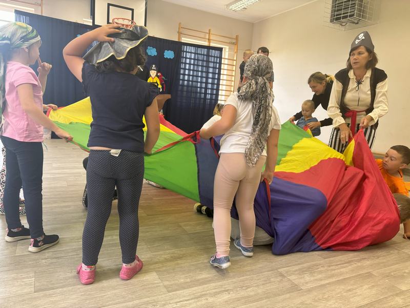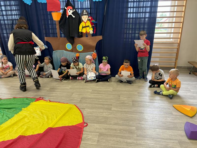 W środę 12 czerwca odbyły się ,,drzwi otwarte" w oddziale przedszkolny, na które przybyli przyszli przedszkolacy wraz z rodzicami. Gości powitano na sali gimnastycznej okrzykiem ,,ahoj" i zaproszono do wspólnej zabawy w piratów. Trzeba było nauczyć się pirackiej piosenki , wciągać żagle na maszt, sterować statkiem, poradzić sobie ze sztormem. Prawdziwym wyzwaniem okazało się pokonanie toru przeszkód, który prowadził na bezludną wyspę. Na niej ukryta była skrzynia ze skarbami. Wszyscy znakomicie poradzili sobie z zadaniem i skarb został odnaleziony.