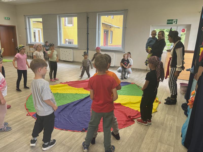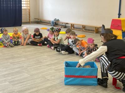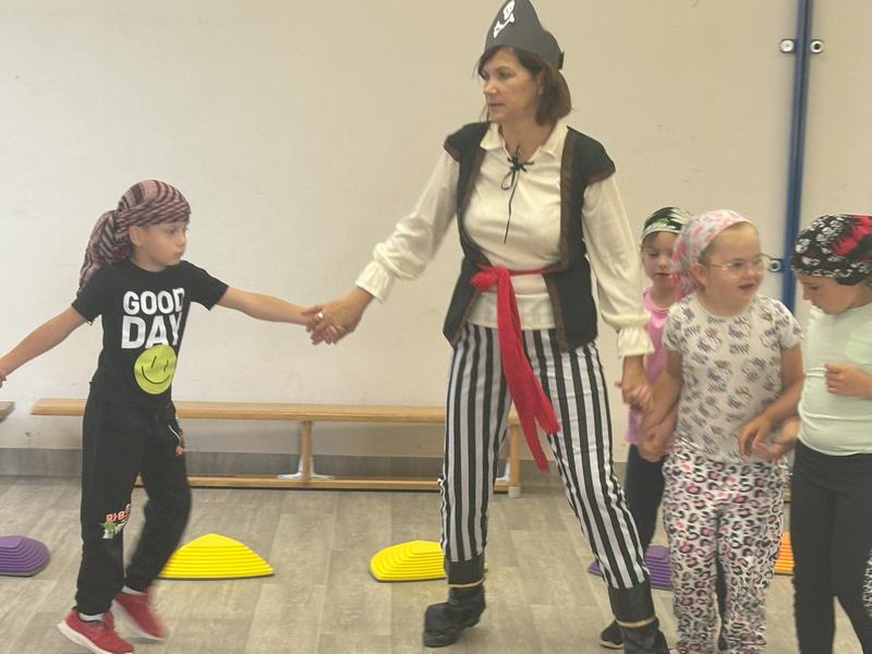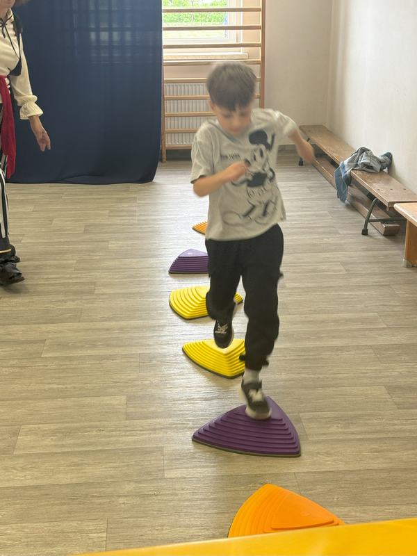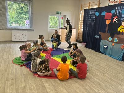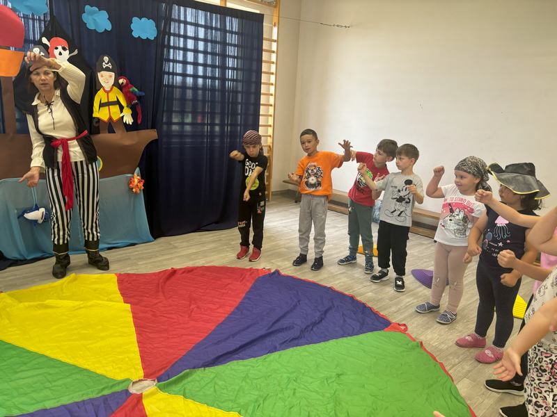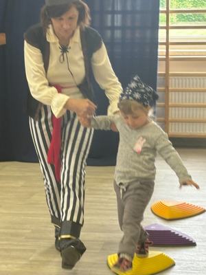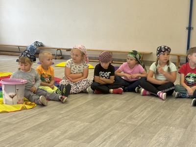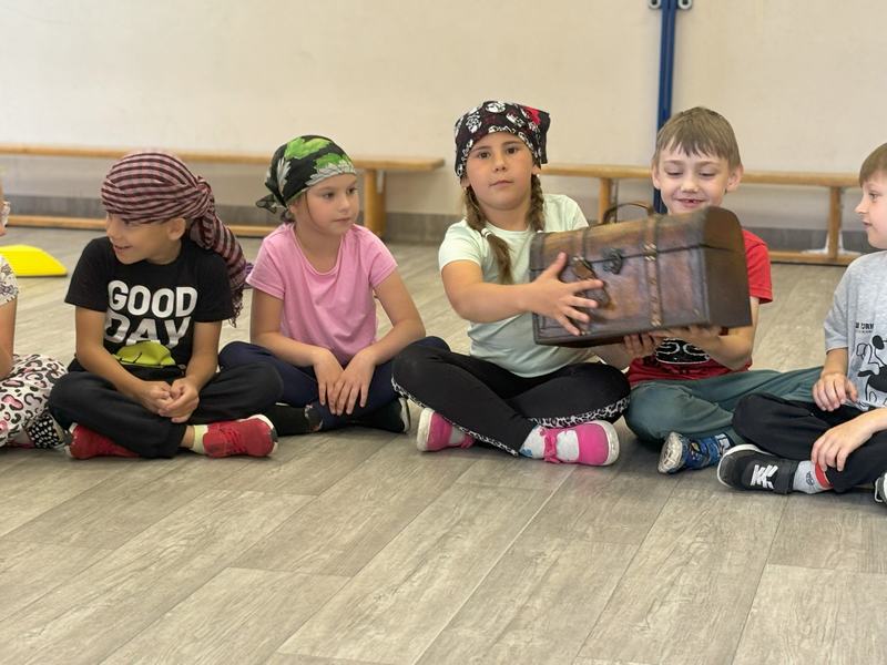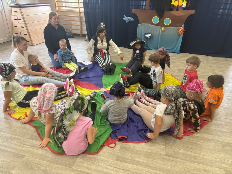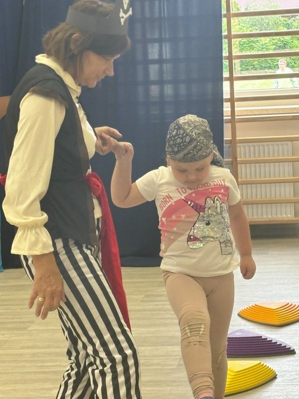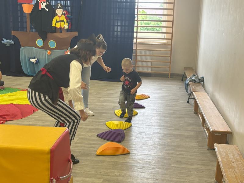 W środę 12 czerwca odbyły się ,,drzwi otwarte" w oddziale przedszkolny, na które przybyli przyszli przedszkolacy wraz z rodzicami. Gości powitano na sali gimnastycznej okrzykiem ,,ahoj" i zaproszono do wspólnej zabawy w piratów. Trzeba było nauczyć się pirackiej piosenki , wciągać żagle na maszt, sterować statkiem, poradzić sobie ze sztormem. Prawdziwym wyzwaniem okazało się pokonanie toru przeszkód, który prowadził na bezludną wyspę. Na niej ukryta była skrzynia ze skarbami. Wszyscy znakomicie poradzili sobie z zadaniem i skarb został odnaleziony.