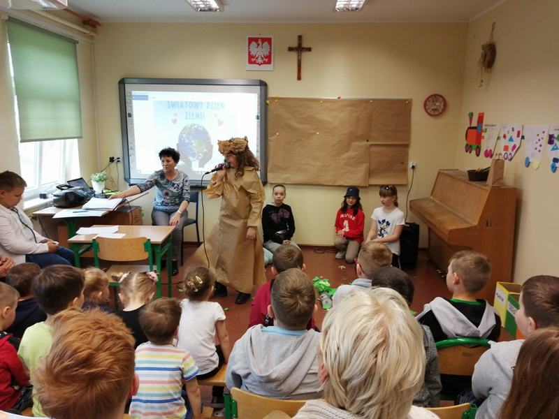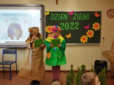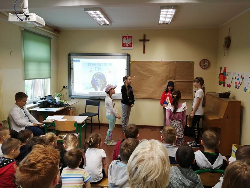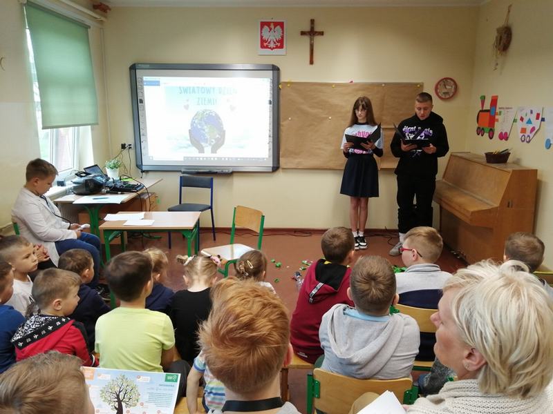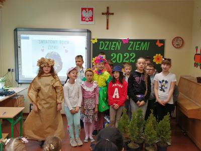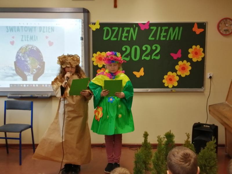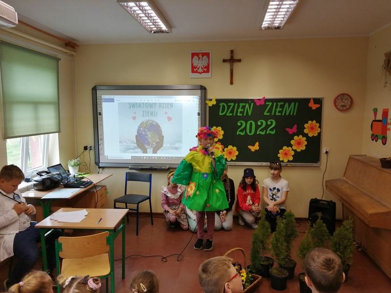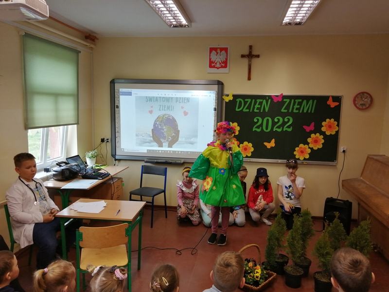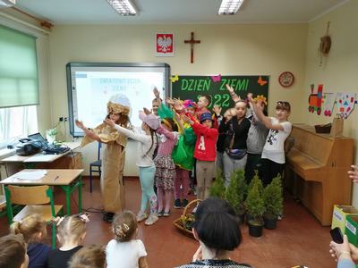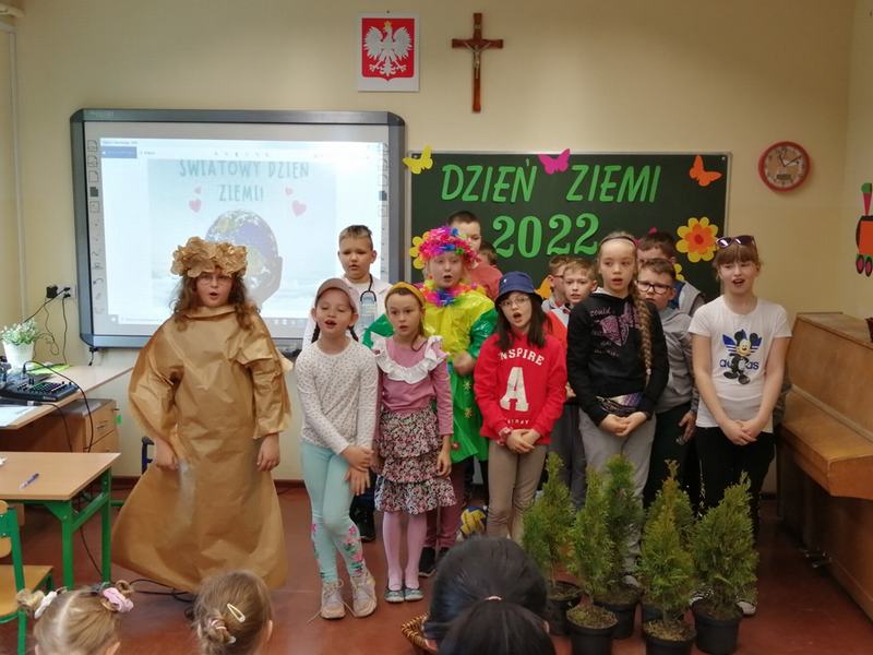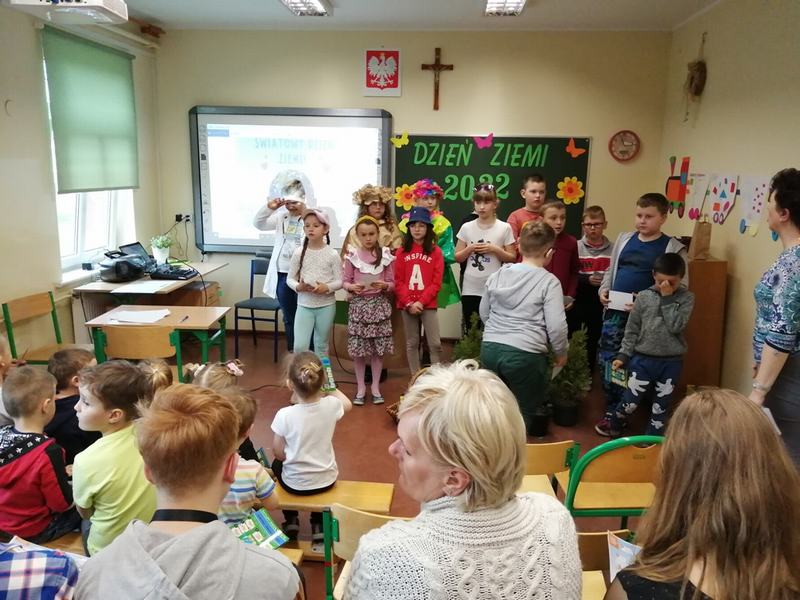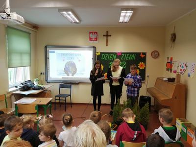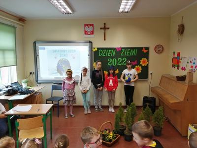 Dzień Ziemi corocznie odbywa się pod innym tematem przewodnim. W tym roku hasłem jest „Inwestujemy w naszą planetę”. Z tej okazji klasa II i III przedstawiła nam inscenizację pt. „Jak dbać o środowisko”. Uczniowie klasy VIII, VII i V przybliżyli młodszym koleżankom i kolegom - Co można robić podczas Dnia Ziemi i nie tylko. Przypomnieli o znaczeniu drzew dla gospodarki człowieka oraz zwierząt. Jest już tradycją, że 22 kwietnia sadzimy drzewa i kwiaty wokół szkoły. Po krótkim apelu wszyscy udali się do wyznaczonych miejsc, gdzie z wielkim zapałem zabrali się do pracy. Każda klasa miała przydzielone drzewko do posadzenia.
