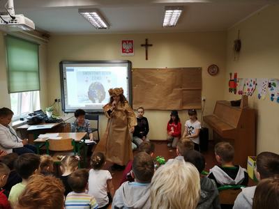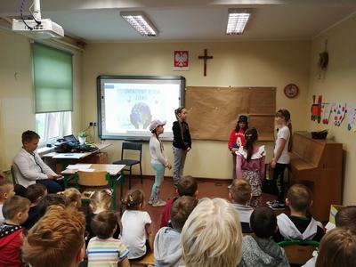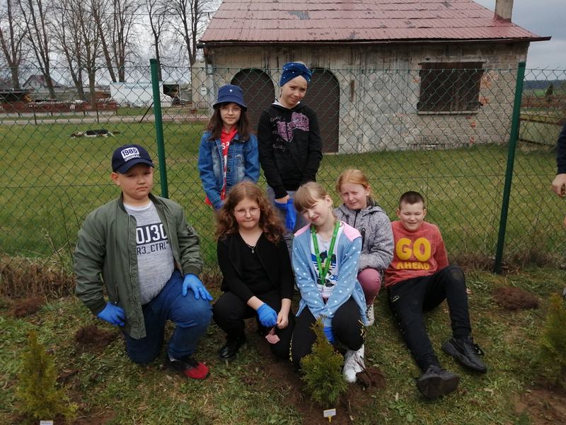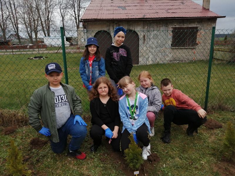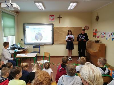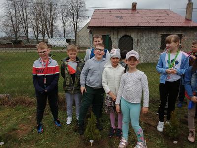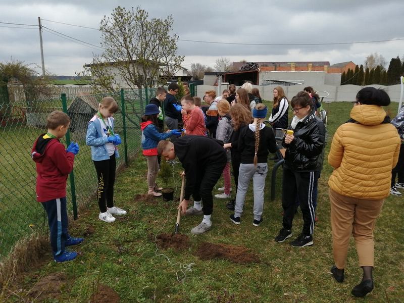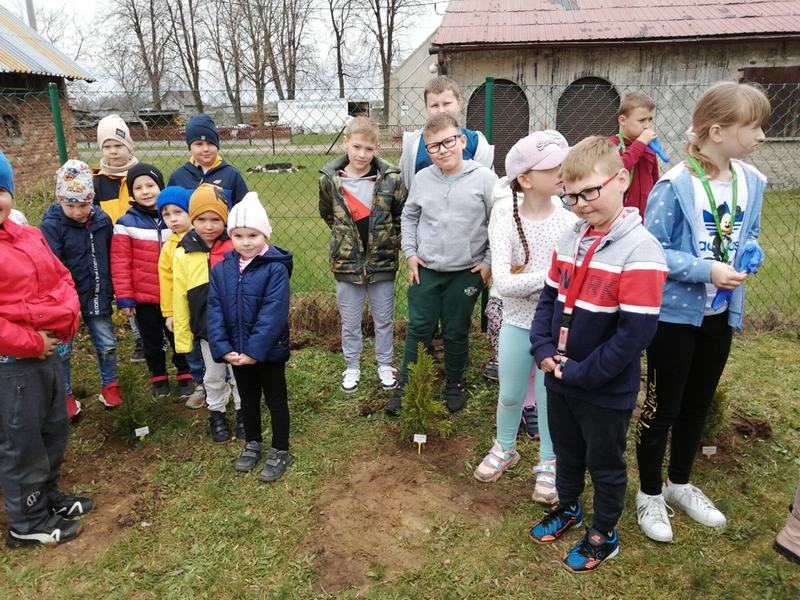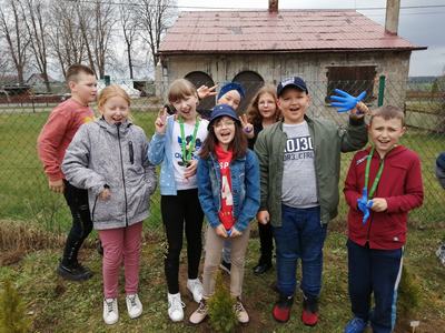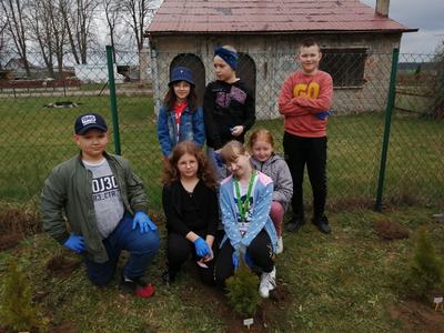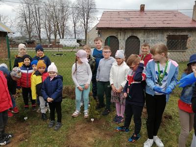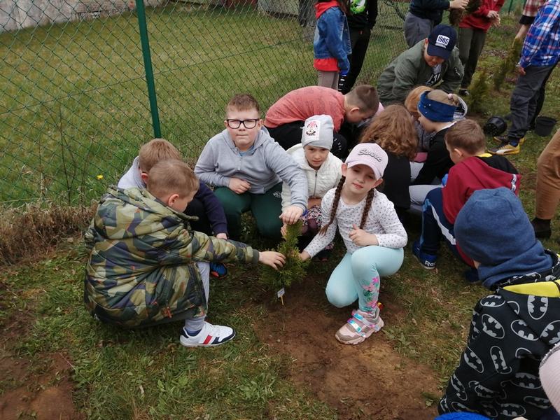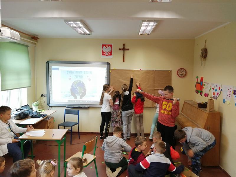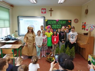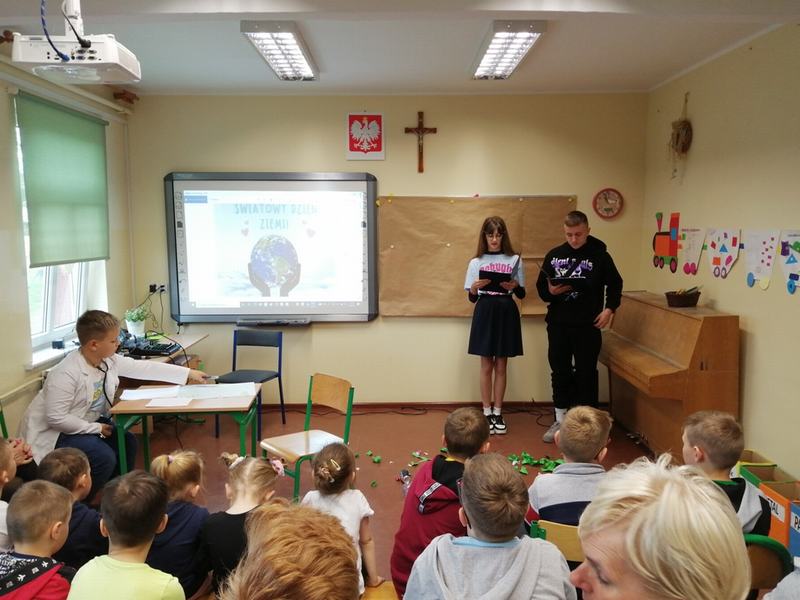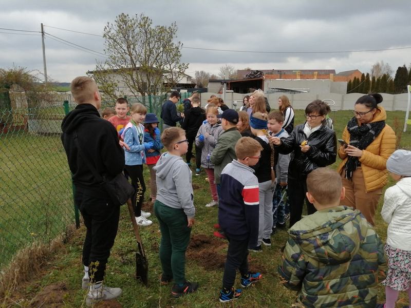 Dzień Ziemi corocznie odbywa się pod innym tematem przewodnim. W tym roku hasłem jest „Inwestujemy w naszą planetę”. Z tej okazji klasa II i III przedstawiła nam inscenizację pt. „Jak dbać o środowisko”. Uczniowie klasy VIII, VII i V przybliżyli młodszym koleżankom i kolegom - Co można robić podczas Dnia Ziemi i nie tylko. Przypomnieli o znaczeniu drzew dla gospodarki człowieka oraz zwierząt. Jest już tradycją, że 22 kwietnia sadzimy drzewa i kwiaty wokół szkoły. Po krótkim apelu wszyscy udali się do wyznaczonych miejsc, gdzie z wielkim zapałem zabrali się do pracy. Każda klasa miała przydzielone drzewko do posadzenia.