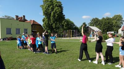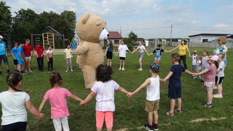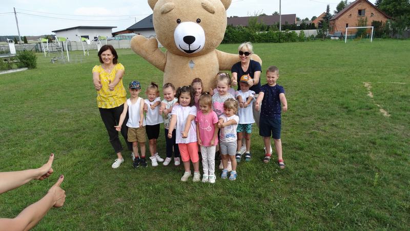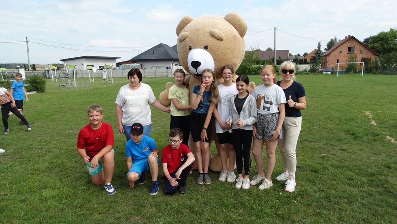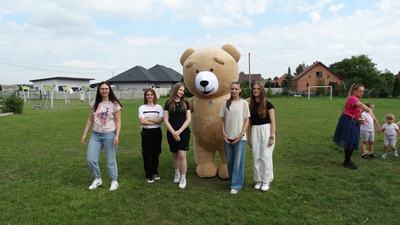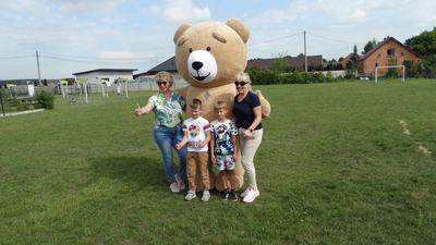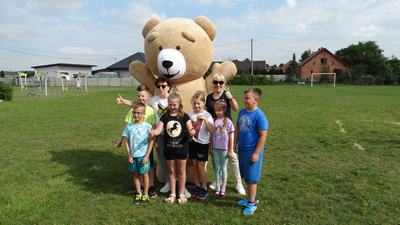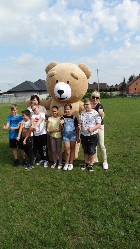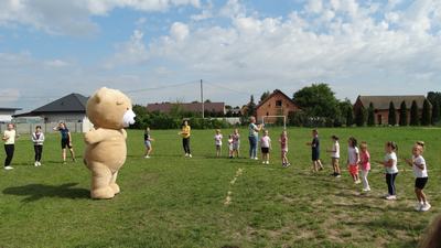 Jest wiele dni w roku, które dzieci lubią najbardziej, niewątpliwie jednym z nich jest Dzień Dziecka. Trudno się temu dziwić, skoro w tym dniu w szkołach organizowane są zabawy oraz dostaje się mnóstwo smakołyków. W naszej szkole Dzień Dziecka świętowaliśmy w piątek 8 czerwca. W przygotowanie programu na tę uroczystość włączyli się rodzice przedszkolaków i uczniów. Punktualnie o godzinie 9.00 społeczność szkolna spotkała się na boisku, gdzie wszystkich powitał sympatyczny miś, który zatańczył z dziećmi w kółeczku, a następnie pozował do zdjęć.