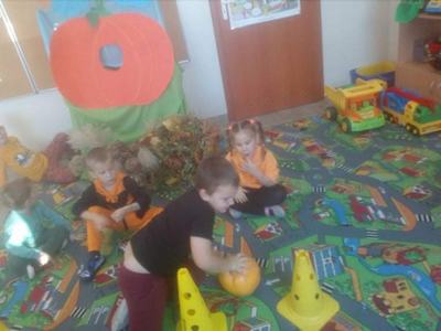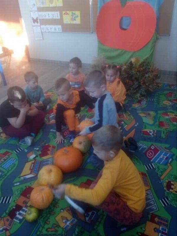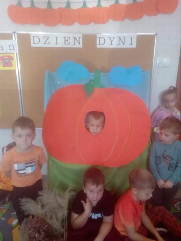 (2021-10-29) 29 października w oddziale przedszkolnym obchodziliśmy ,,Dzień Dyni". Dzieci uczestniczyły w zajęciach podczas, których poznały bardzo zdrowe i urodziwe warzywo jakim jest dynia. Wzięły udział w licznych zabawach z jej udziałem: dyniowym slalomie, skokach przez dynię, dyniowych kręglach, mogły sobie zrobić zdjęcie w ,,dyniowej foto budce". Jedna z mam przygotowała słodką niespodziankę - rogaliki z dżemem dyniowym. Ten dzień był pełen wrażeń i radości.