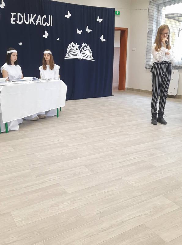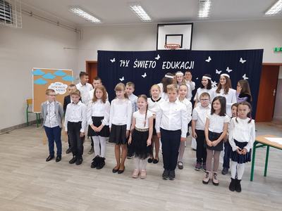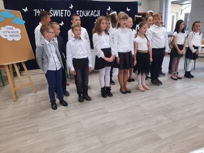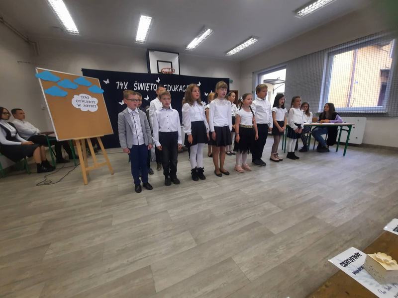 Natomiast dzieci z młodszych klas zaśpiewały dla nauczycieli piękną piosenkę. W części oficjalnej głos zabrała pani dyrektor Janina Siudzińska, która złożyła życzenia wszystkim pracownikom szkoły oraz podziękowała za trud wkładany w kształcenie i wychowanie młodych pokoleń.