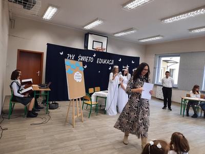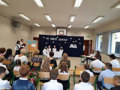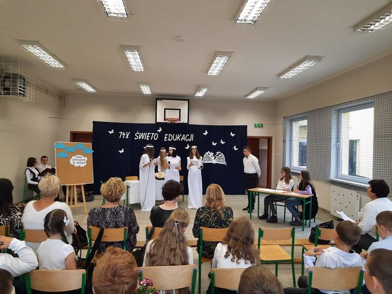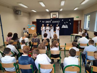 W czwartek 14 października świętowaliśmy Dzień Edukacji Narodowej. Z tej okazji cała społeczność szkoły wzięła udział w uroczystej akademii. Dyrekcji, nauczycielom, wychowawcom oraz pracownikom obsługi część artystyczną przedstawili uczniowie klas V -VIII, zabierając ich na niezwykłą „wycieczkę” do Parku Rozrywki „Niebo”. Wszyscy pracownicy w podziękowaniu za anielską cierpliwość, nieziemską wyrozumiałość oraz dodawanie skrzydeł otrzymali specjalny certyfikat przyjaciela szkoły.