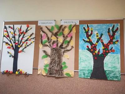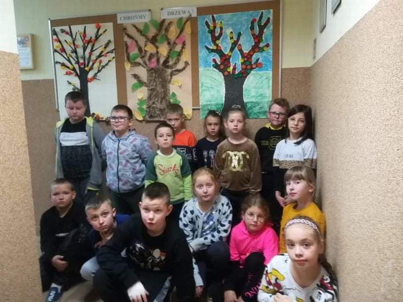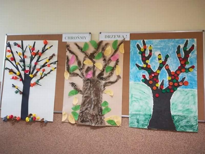 W tym roku uczniowie klasy II i III aktywnie włączyli się do obchodów „Święta drzewa”. Celem akcji było propagowanie postaw proekologicznych związanych z pielęgnacją drzew w najbliższym otoczeniu. Tegoroczne obchody rozpoczęły się od zajęć edukacyjnych w grupach, podczas których dzieci poznawały różne gatunki drzew, ich budowę, owoce i liście. Z dużym zaciekawieniem słuchały opowiadań, wierszy oraz rozwiązywały zagadki zdobywając informacje na temat ochrony drzew i ich pielęgnacji. Następnie powstały piękne ekologiczne prace związane ze znaczeniem drzew w naszym środowisku.