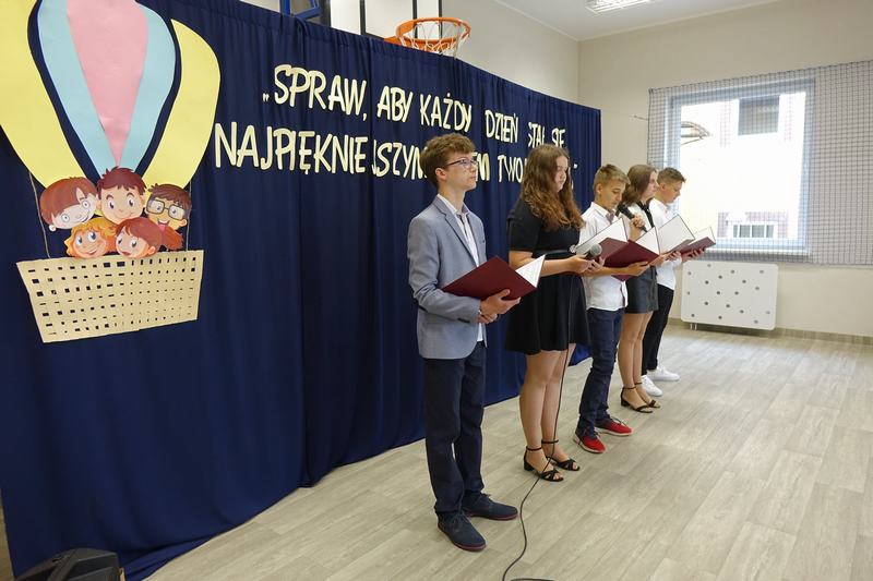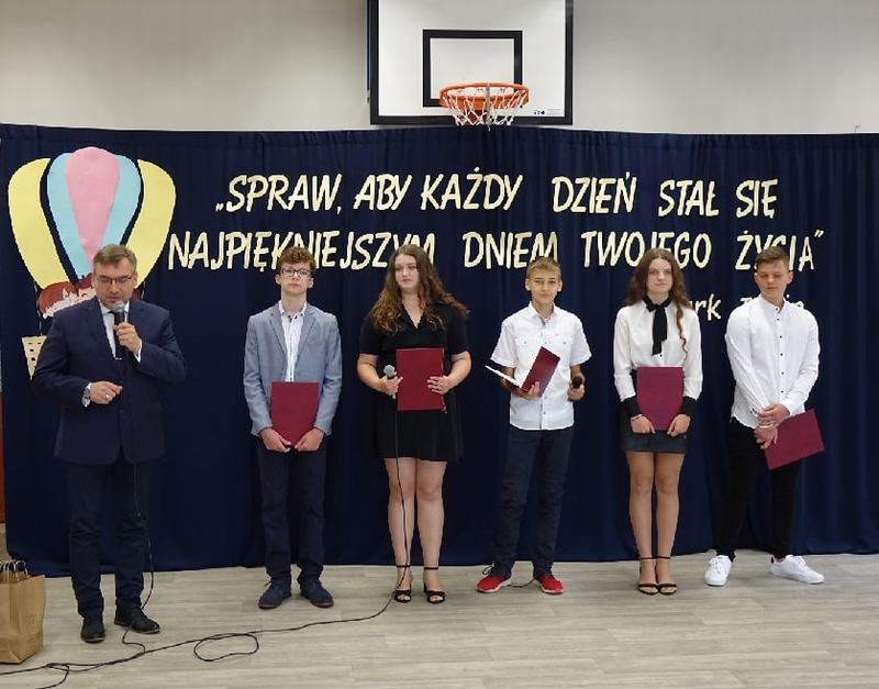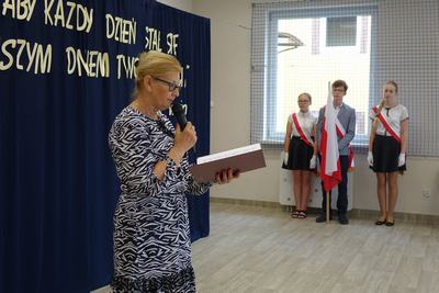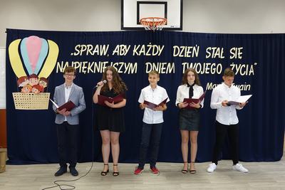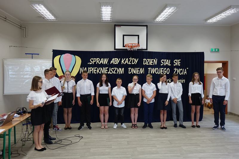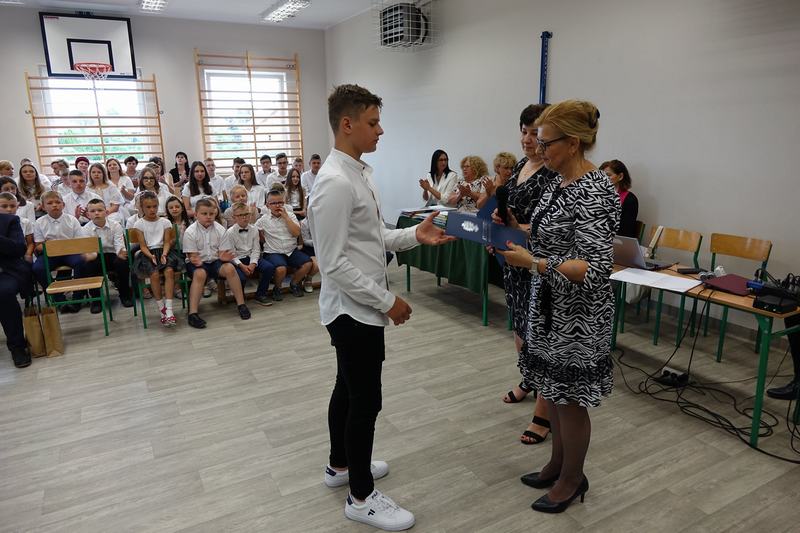 Wręczyła im nagrody książkowe za wysokie wyniki w nauce i wzorowe zachowanie, listy gratulacyjne, świadectwa ukończenia szkoły oraz dyplomy absolwenta. Następnie uczniowie pozostałych klas wyróżniający się w nauce i zachowaniu otrzymali z rąk pani dyrektor nagrody książkowe i świadectwa z biało-czerwonym paskiem. Końcowym punktem oficjalnej części było przekazanie flagi nowemu pocztowi flagowemu.