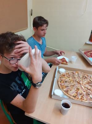 Po wyczerpującym wysiłku fizycznym przyszedł czas na wspólną kolację. Wszyscy z apetytem zajadli się pizzą! Po wspólnej kolacji uczniowie zaopatrzeni w latarki bawili się w chowanego, grali w gry planszowe, a potem odbył się seans filmowy. 8-klasiści zmęczeni, ale pełni wrażeń wrócili w sobotni poranek do domów, gdzie na pewno odsypiali nieprzespaną noc. Nocne spotkanie było świetną okazją do integracji oraz miłego spędzenia czasu. Z pewnością uczniom klasy VIII, którzy niebawem zostaną absolwentami, pozostanie w pamięci wiele ciekawych wspomnień.
