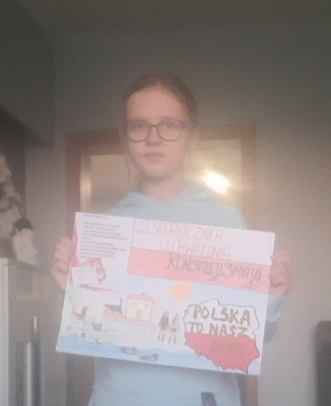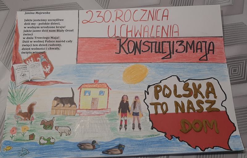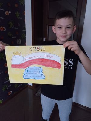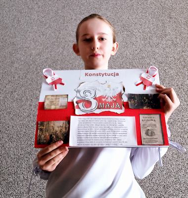 (2021-05-06) Z okazji 230 rocznicy uchwalenia Konstytucji 3 Maja uczniowie klas IV-VIII wzięli udział w konkursie plastycznym i historycznym upamiętniającym to święto. Konkurs plastyczny pod hasłem ,,Konstytucja 3 maja widziana oczami dziecka” skierowany był dla uczniów klas IV-VI- zadaniem uczestników było wykonanie plakatu na temat wydarzeń, bohaterów i symboli związanych z uchwaleniem w 1791 roku Konstytucji 3 Maja. Quiz historyczny przeznaczony był dla klas VII i VIII, którego celem było pogłębienie wiedzy na temat znajomości okresu panowania ostatniego króla Rzeczpospolitej – Stanisława Augusta Poniatowskiego, a zwłaszcza trwania Sejmu Czteroletniego.