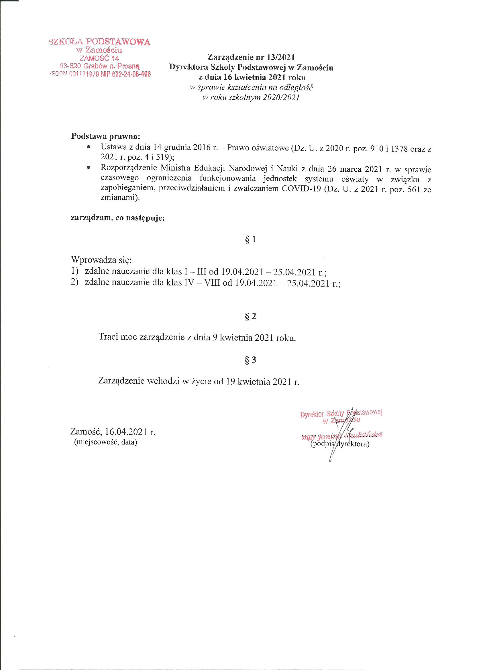 (2021-04-16) Zarządzenie nr 13/2021 Dyrektora Szkoły Podstawowej w Zamościu z dnia 16 kwietnia 2021 roku w sprawie kształcenia na odległość w roku szkolnym 2020/2021