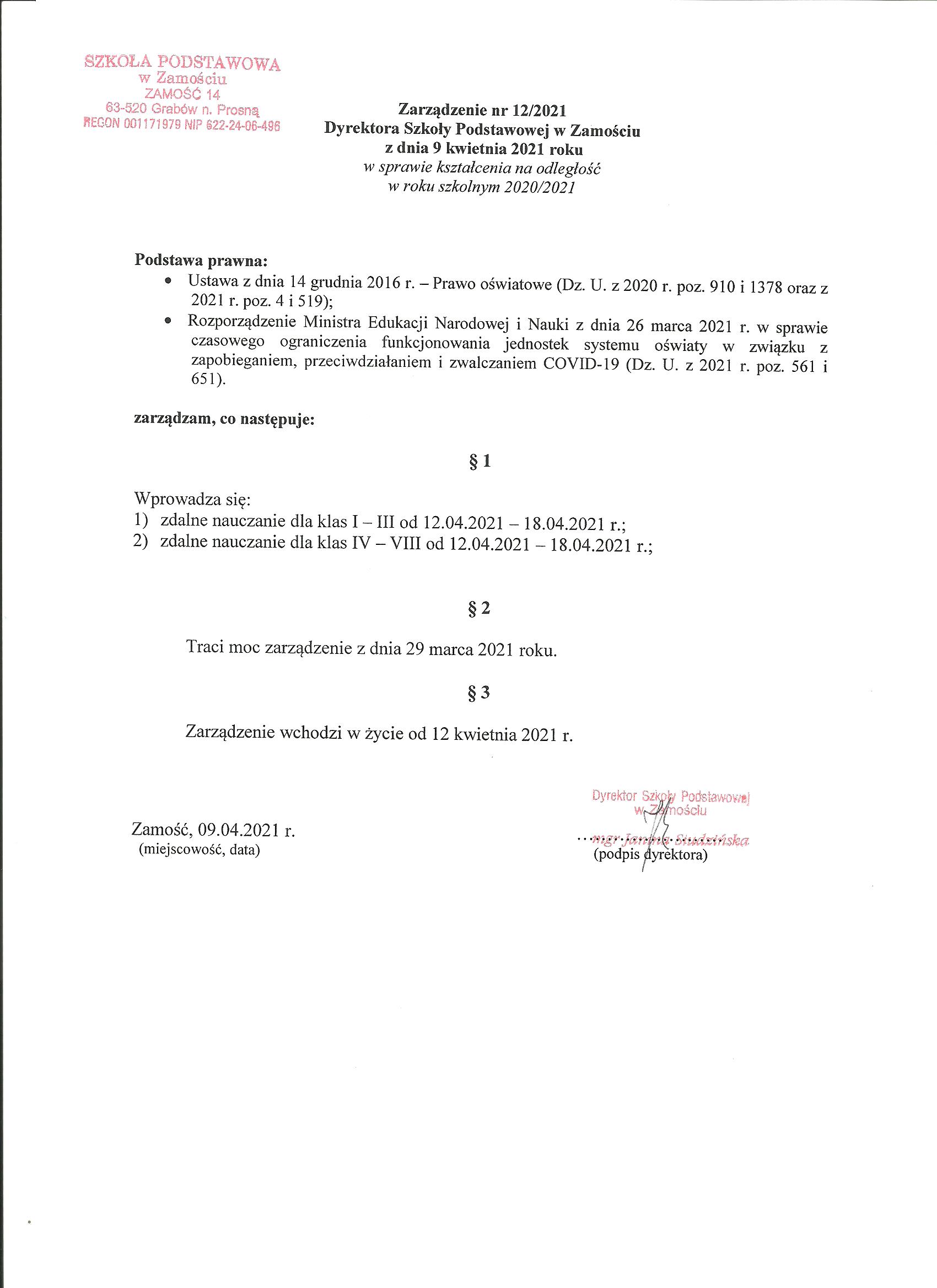 (2021-04-09) Zarządzenie nr 12/2021 Dyrektora Szkoły Podstawowej w Zamościu z dnia 09 kwietnia 2021 roku w sprawie kształcenia na odległość w roku szkolnym 2020/2021