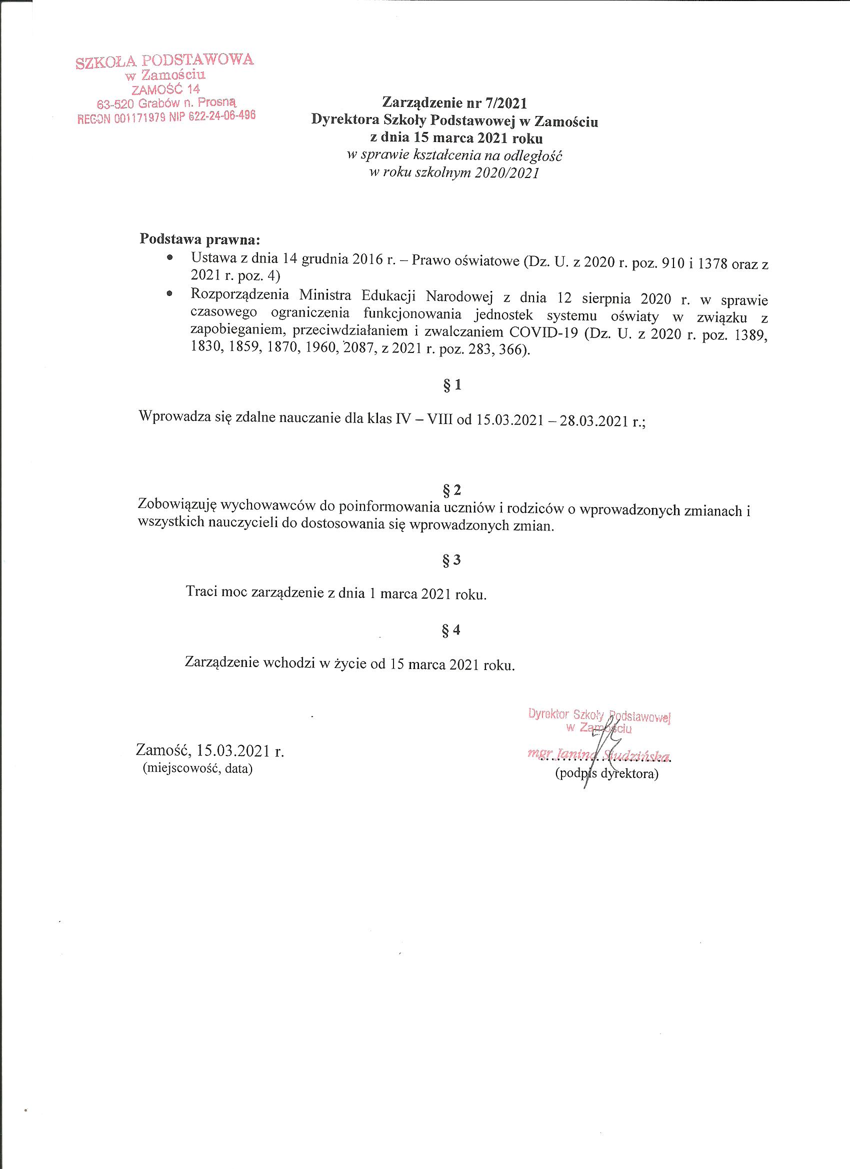 (2021-03-15) Zarządzenie nr 7/2021 Dyrektora Szkoły Podstawowej w Zamościu z dnia 15 marca 2021 roku w sprawie kształcenia na odległość w roku szkolnym 2020/2021