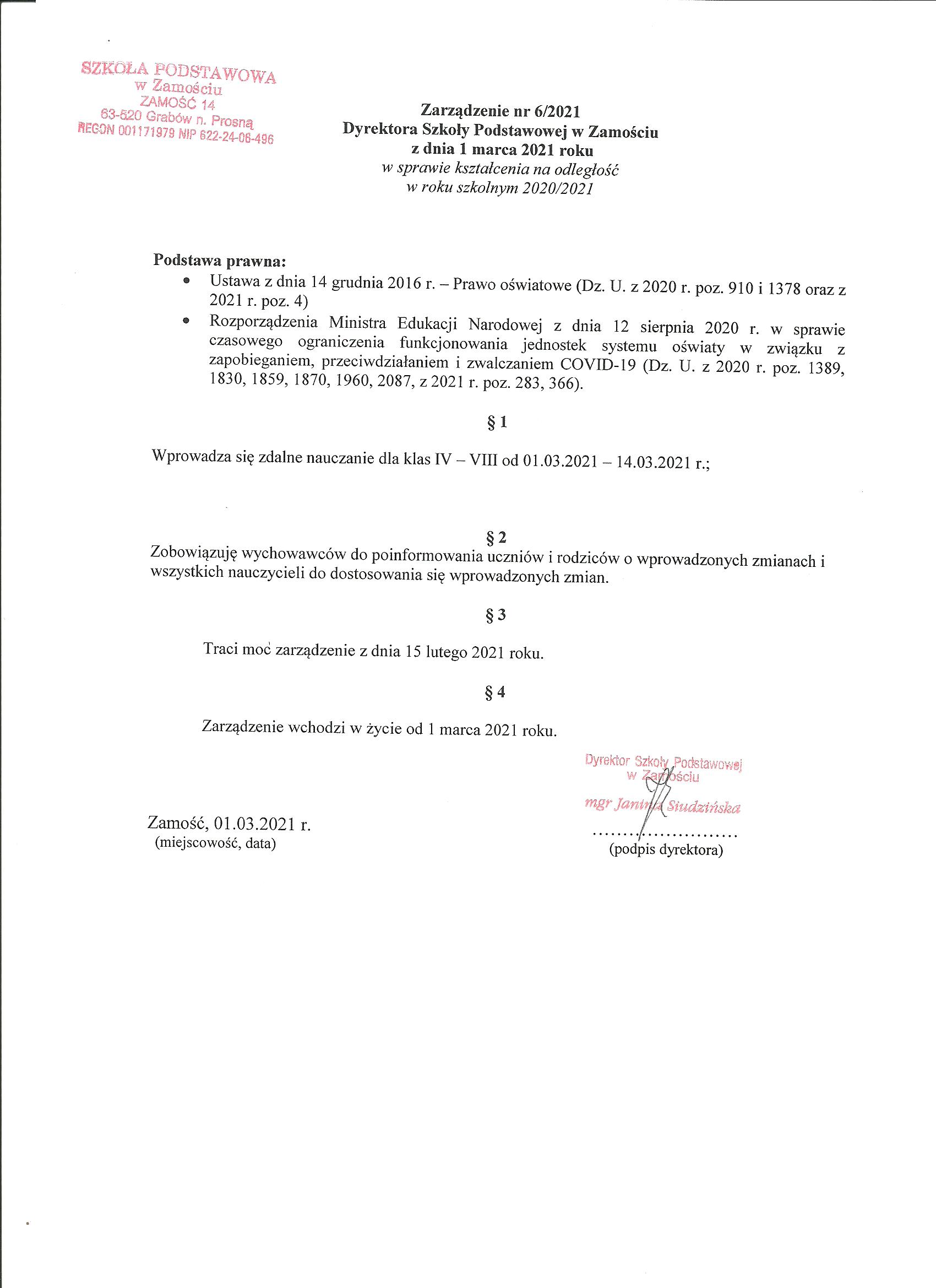 (2021-03-01) Zarządzenie nr 6/2021 Dyrektora Szkoły Podstawowej w Zamościu z dnia 1 marca 2021 roku w sprawie kształcenia na odległość w roku szkolnym 2020/2021