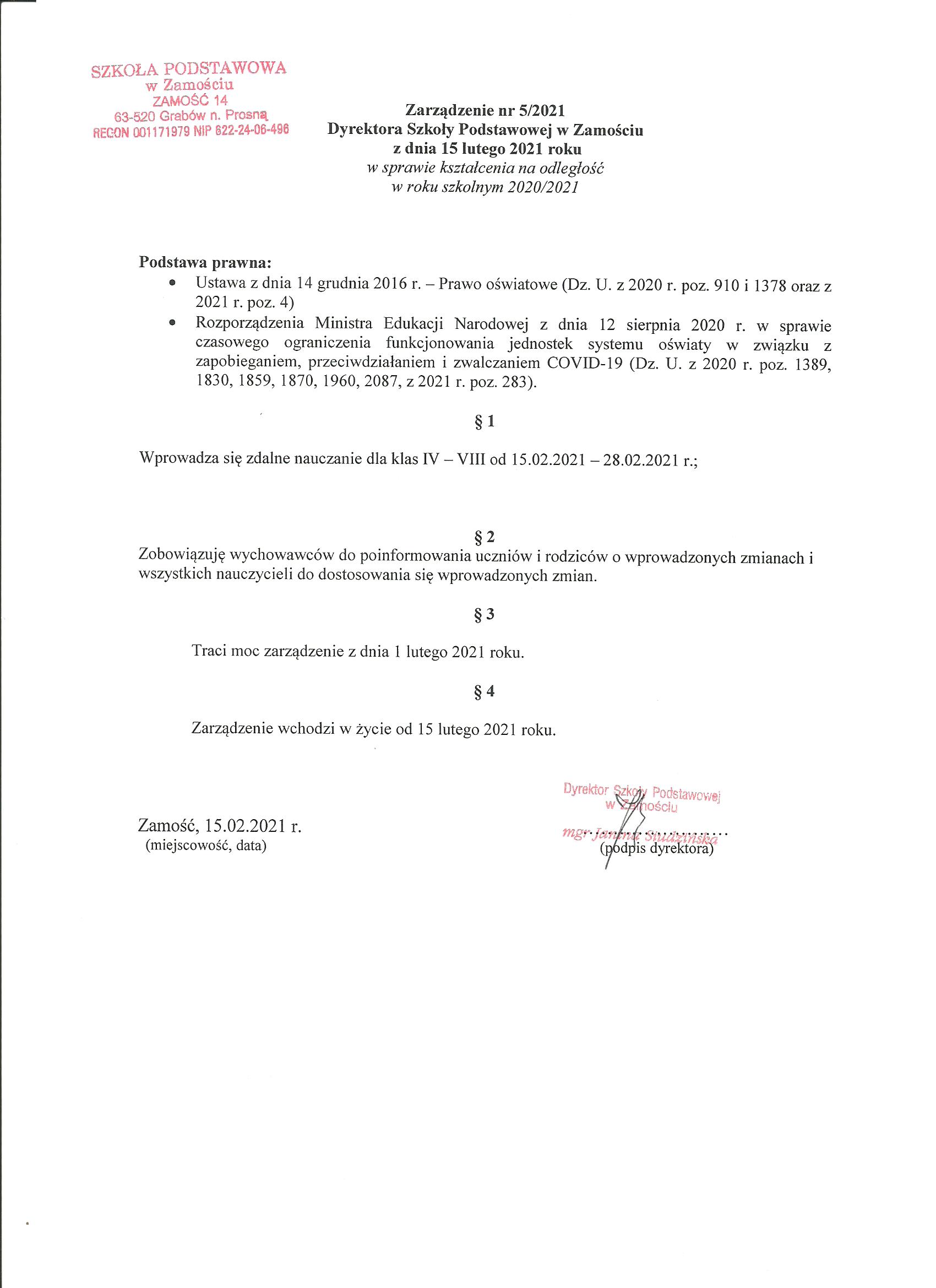 (2021-02-15) Zarządzenie nr 5/2021 Dyrektora Szkoły Podstawowej w Zamościu z dnia 15 lutego 2021 roku w sprawie kształcenia na odległość w roku szkolnym 2020/2021