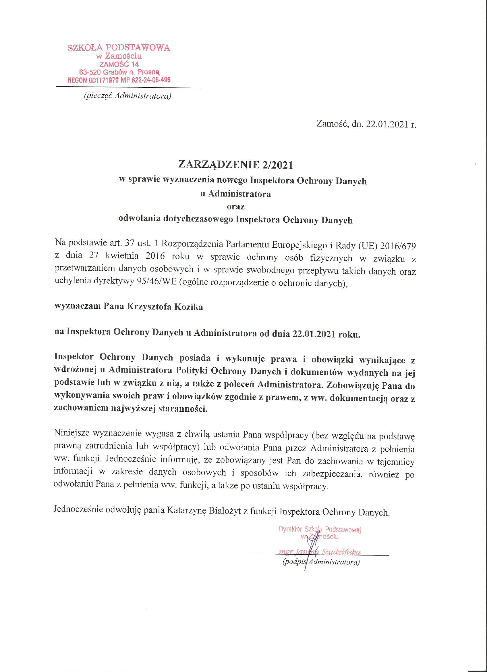 (2021-01-22) Zarządzenie nr 2/2021 Dyrektora Szkoły Podstawowej w Zamościu z dnia 22 stycznia 2021 roku w sprawie wyznaczenia nowego Inspektora Ochrony Danych Ososbowych u Administratora oraz odwołania dotychczasowego Inspektora Ochrony Danych