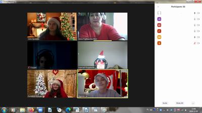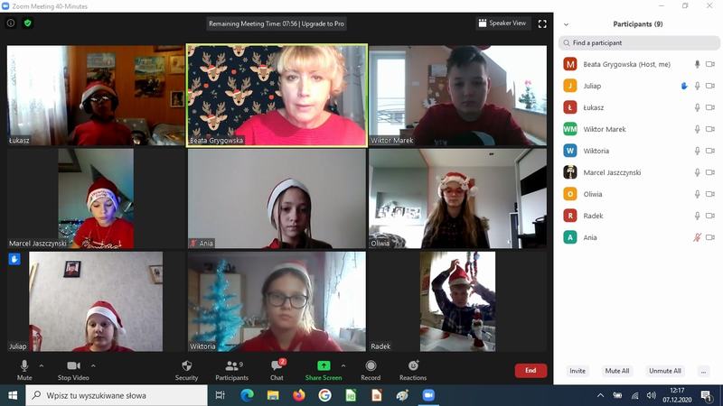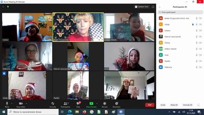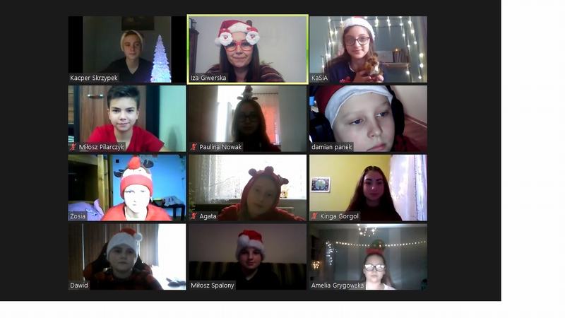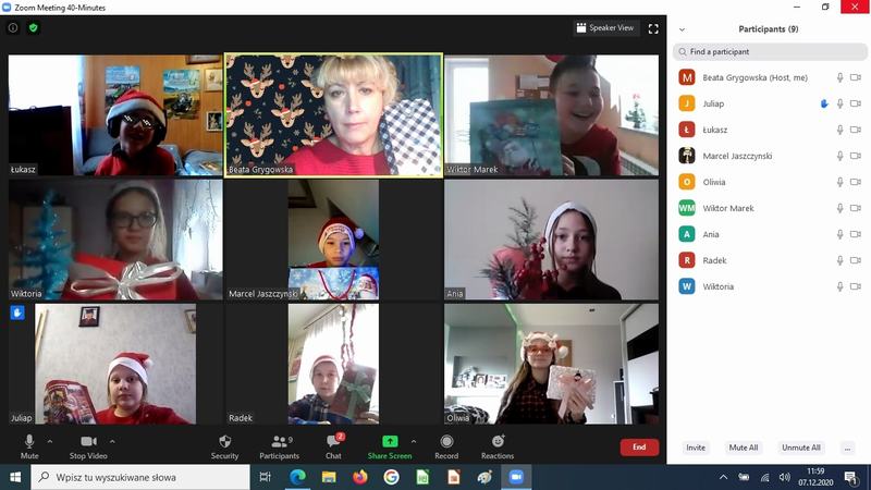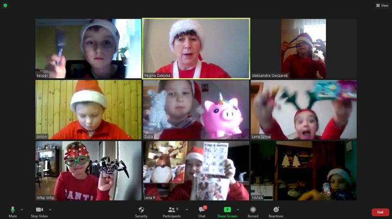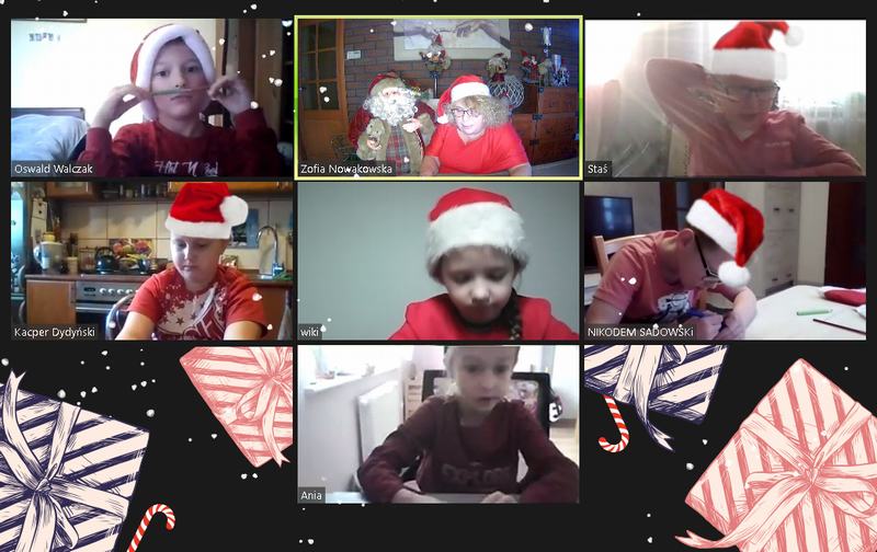 Tegoroczne mikołajki uczniowie naszej szkoły przeżywali inaczej niż zwykle. W ten wyjątkowy dzień wychowawcy klas połączyli się ze swoimi podopiecznymi na platformie Zoom, w dobrych nastrojach, w mikołajkowych czapeczkach oraz przy świątecznych piosenkach. Nauczyciele przygotowali dla uczniów ciekawe zajęcia, które dostarczyły wiele radości. Najbardziej wszystkich rozbawiło zadanie, w którym dziecko przygotowywało prezent – niespodziankę, np. wałek do ciasta dla koleżanki lub kolegi, następnie rozpakowywało go dla wylosowanej osoby.