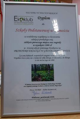 Nasza szkoła zdobyła I miejsce i została nominowana na Promotora Ekologii Gminy Sieroszewice na lata 2020-2023, otrzymując puchar wraz z nagrodą wysokości 1000 zł, która została wpłacona na konto Rady Rodziców przy Szkole Podstawowej w Zamościu.