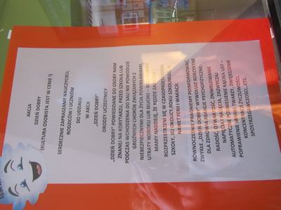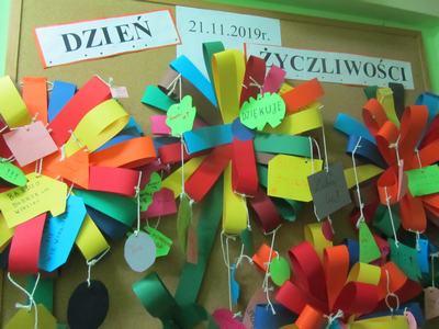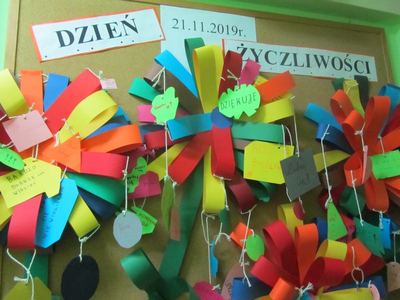 (2019-11-21) 21 listopada 2019 roku już kolejny raz obchodziliśmy w naszej szkole Światowy Dzień Życzliwości i Pozdrowień, aby podkreślić jak ważne dla każdego człowieka jest: potrzeba szacunku, serdeczności, uśmiechu, mówienie dobrych słów i niesienie bezinteresownej pomocy innym. W tym dniu w klasach, na lekcjach wychowawczych rozmawialiśmy na temat życzliwości. Na korytarzach zawisły plakaty i przysłowia na temat życzliwości i uśmiechu. Ten jesienny poniedziałek na długo pozostanie w pamięci uczniów. Od wczesnych godzin rannych szkoła tętniła życiem, a uśmiech towarzyszył wszystkim.