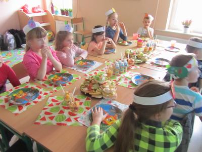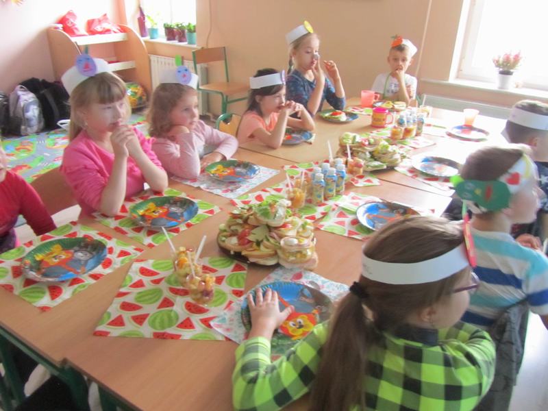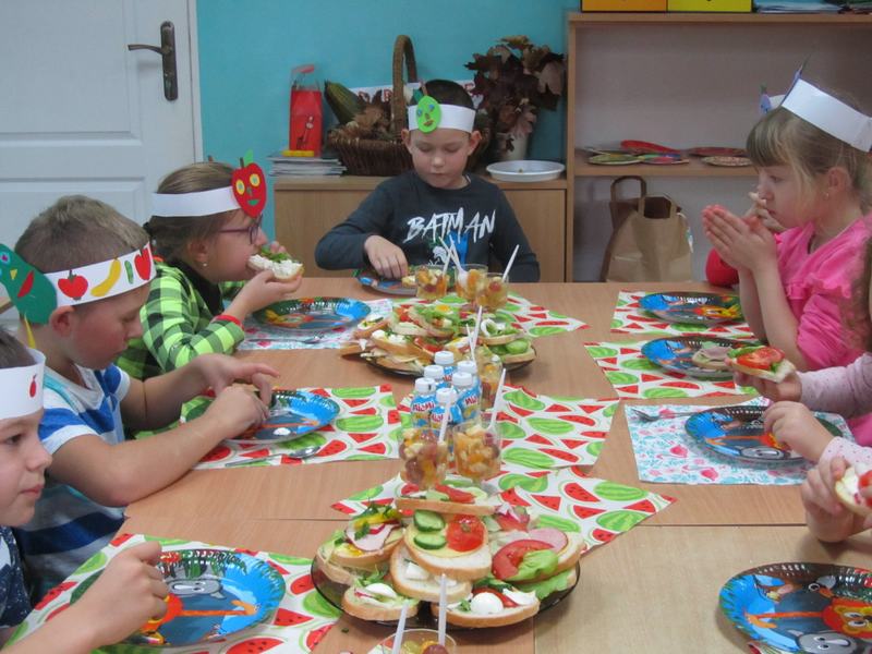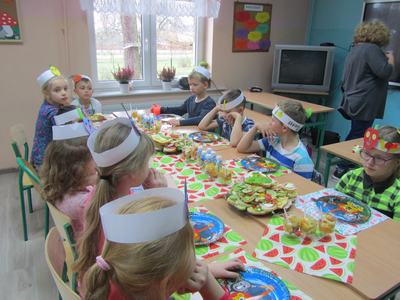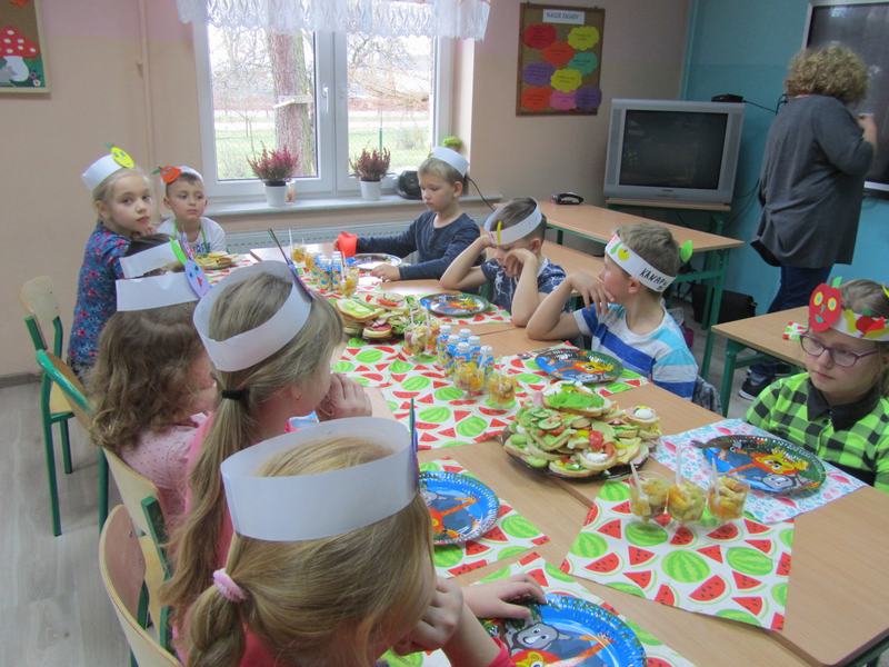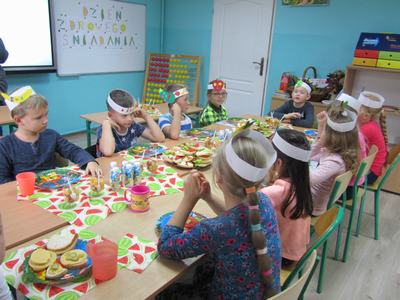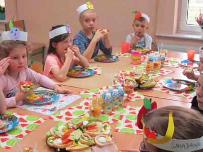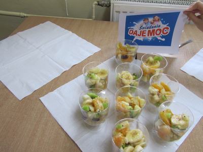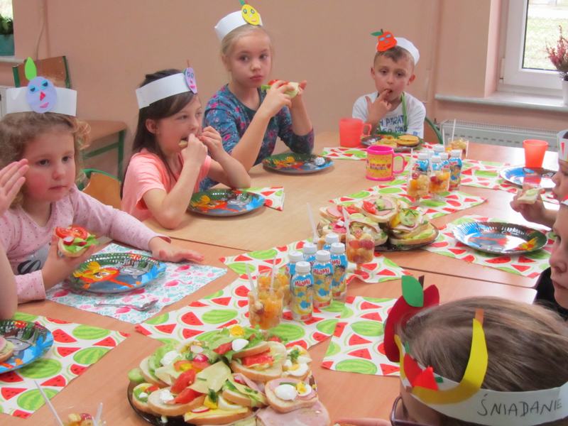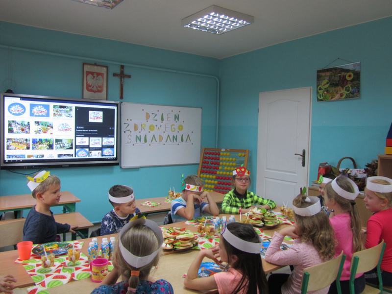 Podobnie jak w roku ubiegłym dzieci z oddziału przedszkolnego oraz uczniowie klasy I i III włączyli się do ogólnopolskiej akcji edukacyjnej „Śniadanie daje moc” organizowanej w ramach Europejskiego Dnia Zdrowego Jedzenia i Gotowania. Uczniowie najpierw założyli odpowiednie stroje, umyli ręce, a następnie wspólnie przygotowywali drugie śniadanie. Na stolikach znalazły się kolorowe kanapki, sałatka owocowa oraz pyszne jogurty. Oprócz tego przeprowadzono pogadanki na temat roli śniadania jako najważniejszego posiłku w ciągu dnia. Dzięki niemu dzieci mają siłę i energię do nauki i zabawy, lepiej się koncentrują na wykonywanych zadaniach.