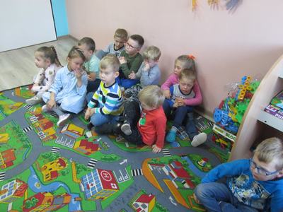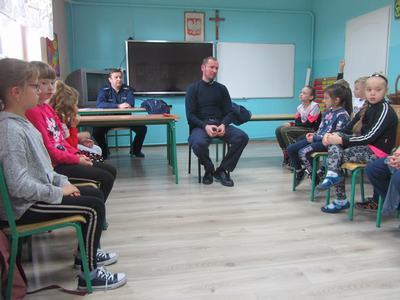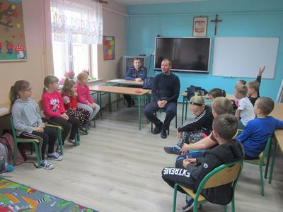W grupie młodszej policjanci zapoznali dzieci z podstawowymi zasadami bezpieczeństwa obowiązującymi w ruchu drogowym. Dzieci miały okazję porozmawiać z policjantami o zachowaniu bezpieczeństwa w drodze do szkoły i poza szkołą. Policjanci omówili zasady poruszania się po ulicy, chodniku i podczas jazdy rowerem oraz zwrócili uwagę na niebezpieczeństwa, jakie mogą czyhać na dzieci w kontaktach z obcymi. Omówili sposoby unikania ich. Ponadto podkreślili, jak ważną rolę pełnią elementy odblaskowe, które każdy uczeń powinien posiadać.
