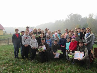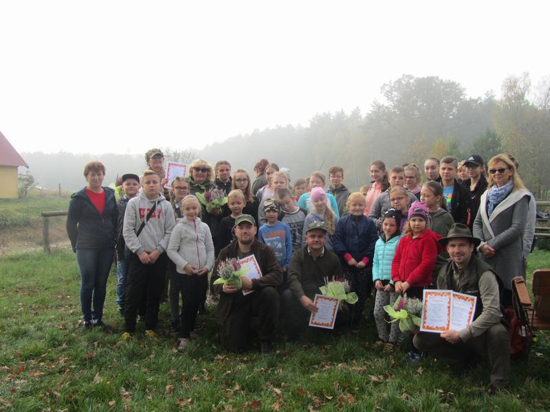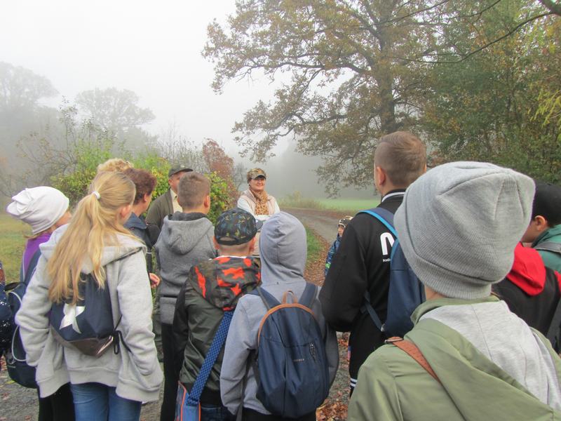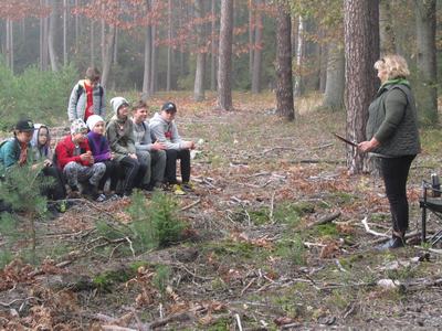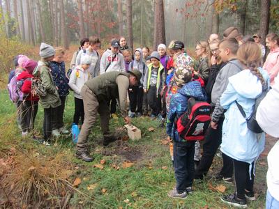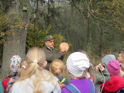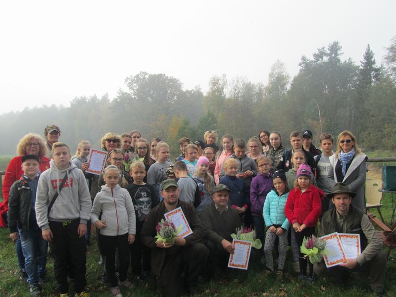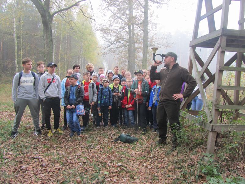 (2019-10-24) Lekcja przyrody uczniów Szkoły Podstawowej w Zamościu w Leśnictwie Biskupice. We wtorek 24 października uczniowie naszej szkoły wraz z wychowawcami, odpowiadając na zaproszenie przedstawicielki Koła Łowieckiego nr 4 „Wielowieś” pani Moniki Kędziory, gościli w Leśnictwie Biskupice. Myśliwi przygotowali fascynującą lekcję przyrody. Zajęcia odbywały się na terenie lasu, gdzie prowadzący omawiali interesujące tematy. Na pierwszym stanowisku leśniczy – pan Dariusz Stendera ciekawie opowiadał o drzewach, na kolejnym pani Anna Kędziora barwnie mówiła o ptakach. Następnie, kierując się pozostawionymi na leśnej drodze specjalnymi znakami uczniowie musieli odnaleźć kolejne stanowisko.