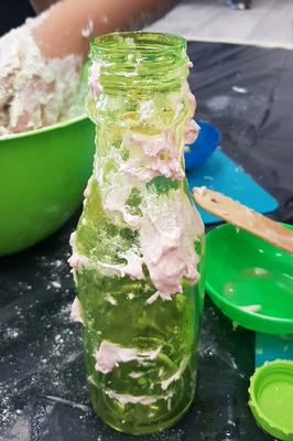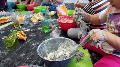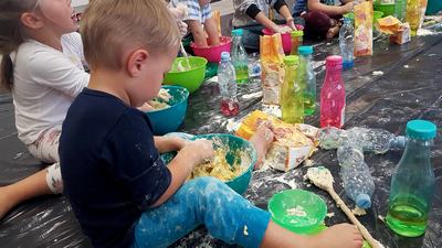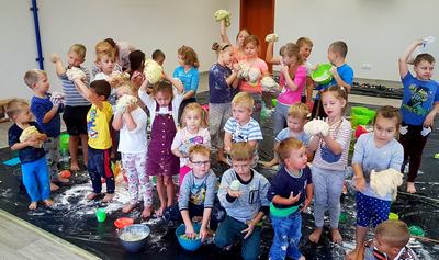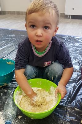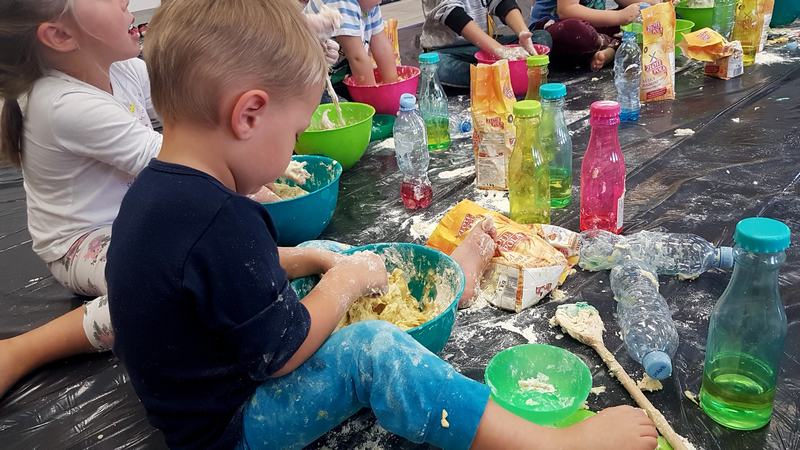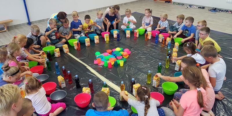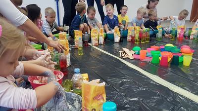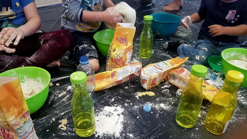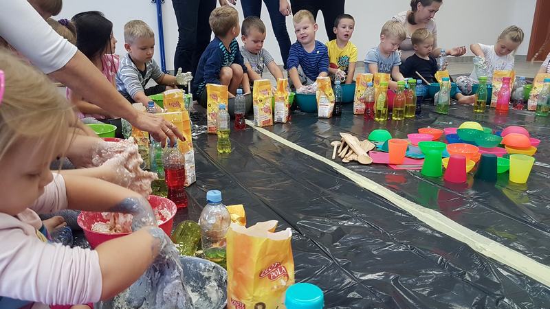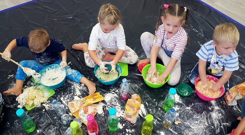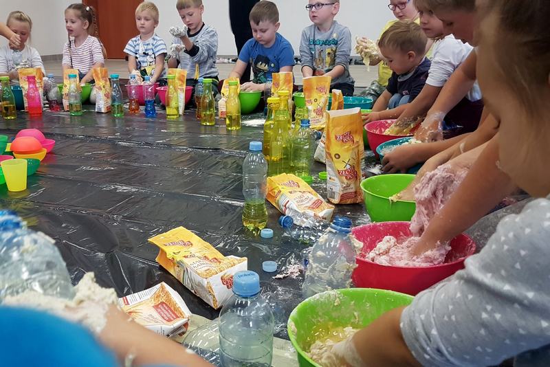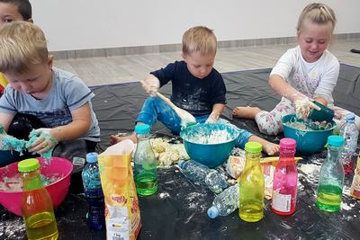 (2019-10-04) W dniu 4 października 2019 roku dzieci z oddziału przedszkolnego, uczniowie klasy I - III uczestniczyły w warsztatach sensoplastycznych. Sensoplastyka to marka zajęć rozwojowych dla dzieci w wieku od 0 do100 lat. Nazwa wywodzi się od angielskiego słowa „sense”, oznaczającego zmysł lub odczucie. Najprościej mówiąc są to zajęcia plastyczne z wykorzystaniem wszelkiego rodzaju kolorów, faktur, konsystencji a nawet… smaków! Senoplastyka oddziałuje na wszystkie zmysły jednocześnie i pomaga dziecku rozwijać niczym nieskrępowaną aktywność na wszelkich płaszczyznach. Dzieci. miały do dyspozycji mąkę, wodę ,,olej, barwniki spożywcze, miski łyżki , kubki itp. Miały okazję obserwować np. jak materiał, który jest suchy i sypki zmienia się w mokry i kleisty, a następnie w miękki i stały.