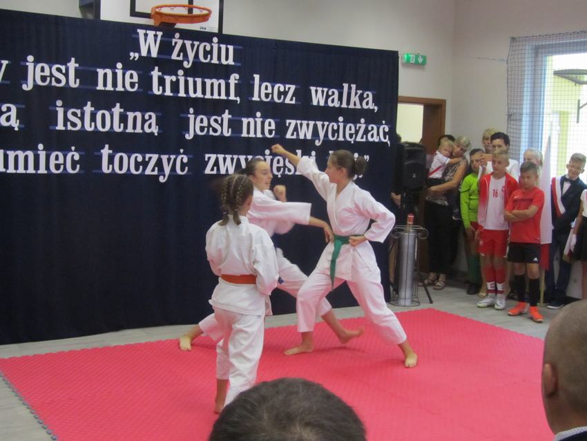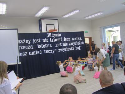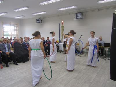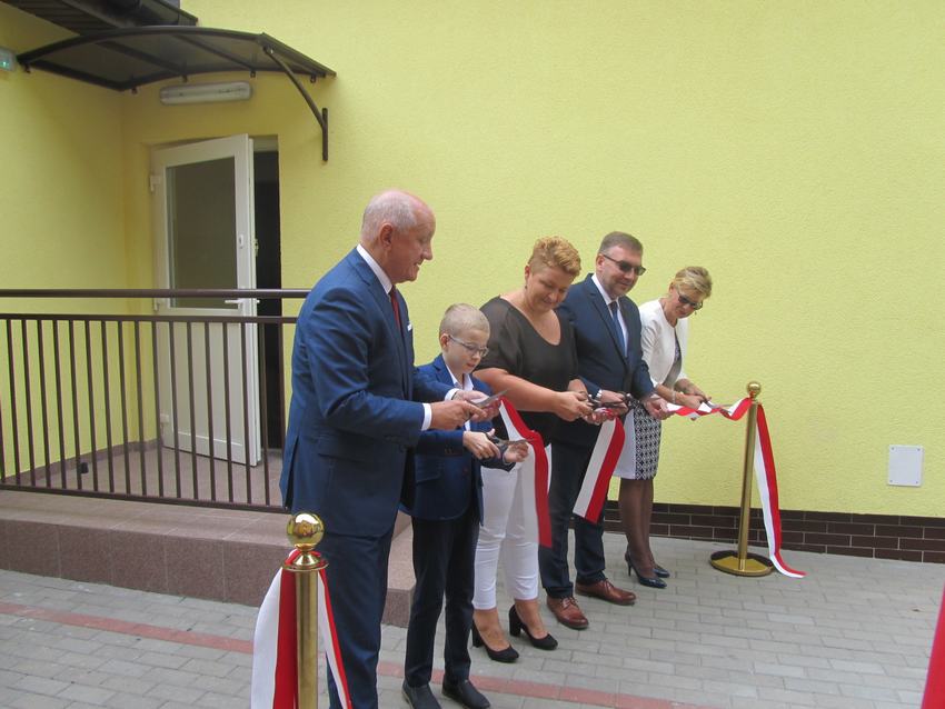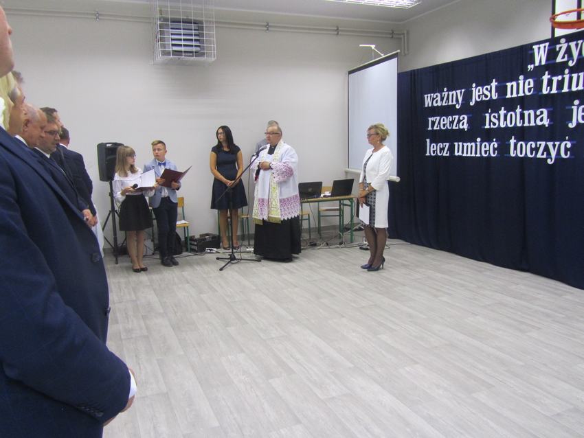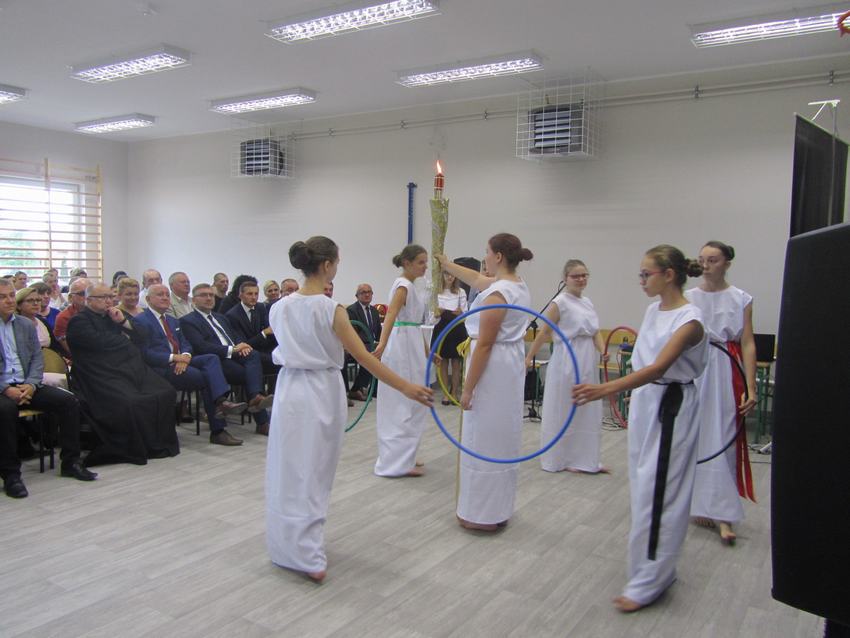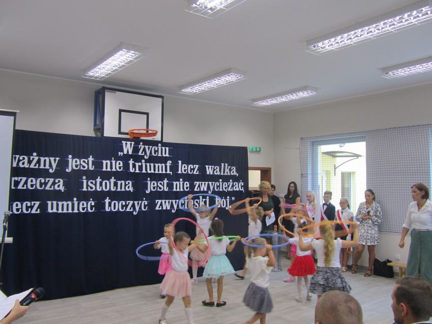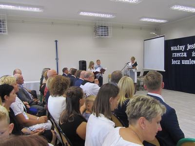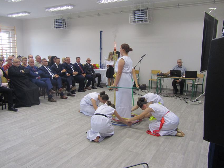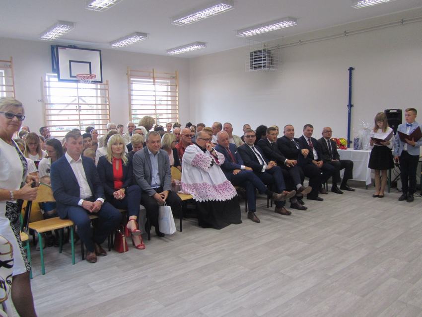(2019-09-02) Spełniły się nasze marzenia..., 02 września 2019r. był dla całej społeczności szkolnej dniem wyjątkowym. W atmosferze ciepła, radości i wzruszenia nastąpiło nie tylko rozpoczęcie nowego roku szkolnego, ale również oficjalne i uroczyste otwarcie dobudowanego segmentu szkoły, w którym znajduje się sala gimnastyczna wraz z zapleczem, sala dla oddziału przedszkolnego z szatnią oraz sekretariat. Na ten dzień z niecierpliwością czekali uczniowie, rodzice i nauczyciele. W tym szczególnym momencie w dziejach szkoły zebrało się grono znamienitych osób. W uroczystości udział wzięli przedstawiciele władz samorządowych, kościelnych, dyrektorzy gminnych palcówek oświatowych, przyjaciele szkoły, pracownicy obsługi, nauczyciele, uczniowie i ich rodzice.