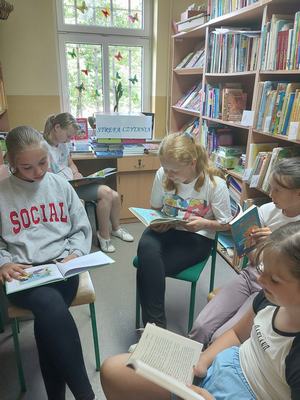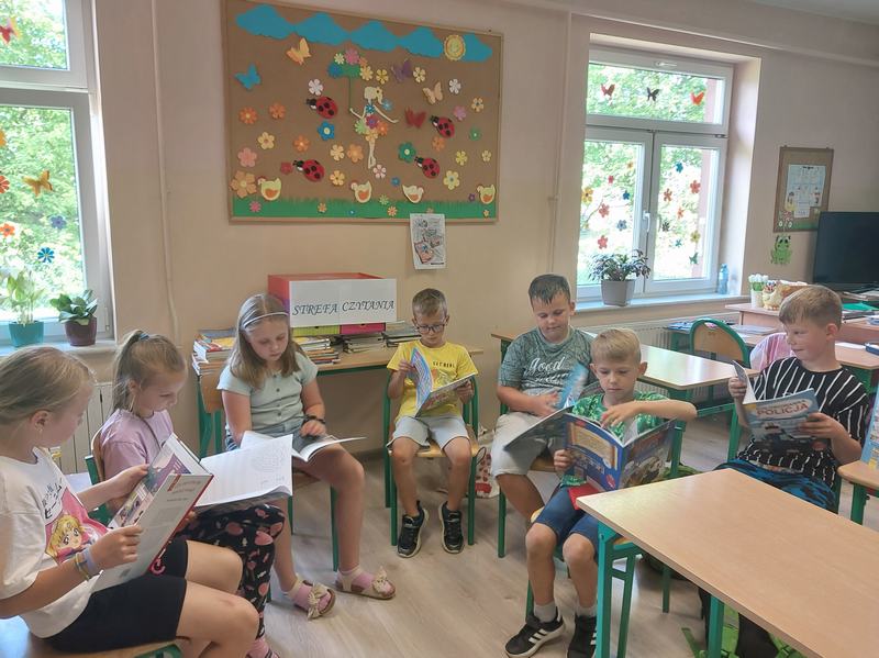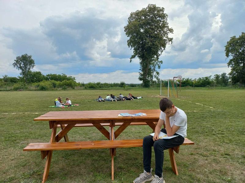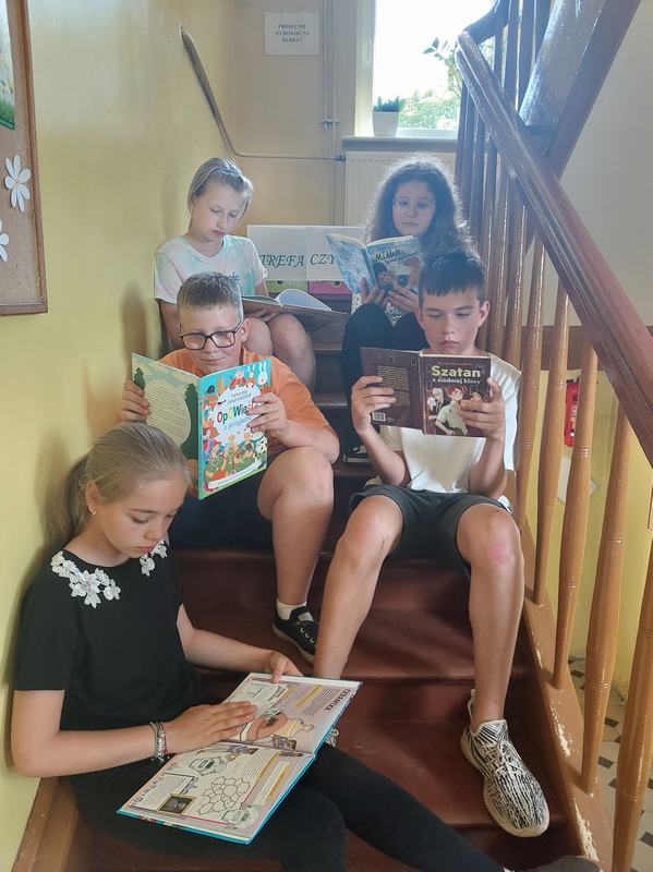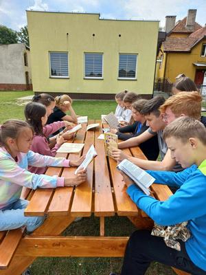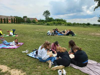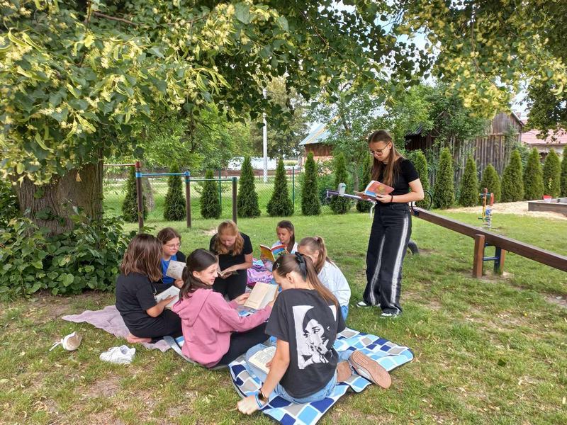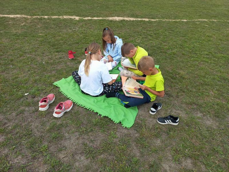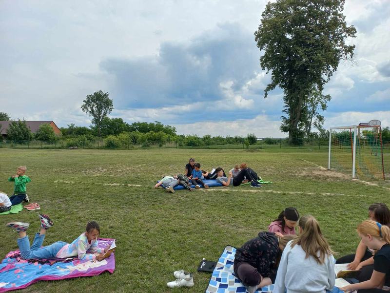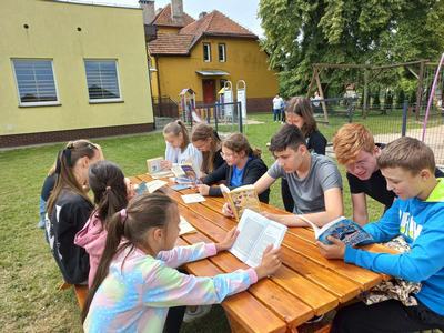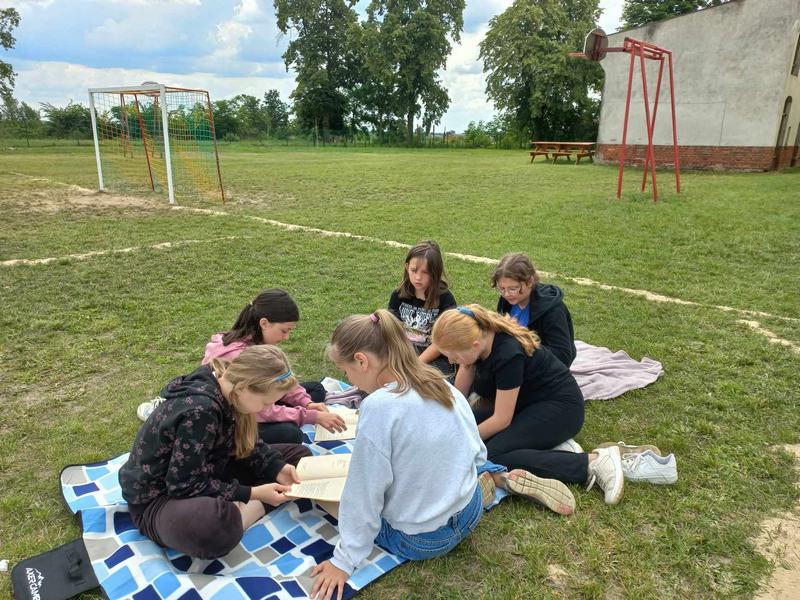 18 czerwca uczniowie wzięli udział w akcji „Czytanie na trawie – Dzień Pustej Klasy”. W atmosferze piknikowej spędzili miło czas na czytaniu książek zaproponowanych przez panią bibliotekarkę- Reginę Zalejską. Wydarzenie odbyło się na terenie szkoły, wśród zielonych drzew, w otoczeniu pięknej przyrody. Miejsce to sprzyjało relaksowi i stworzyło doskonałe warunki do czytania książek. Głównym celem tej inicjatywy była promocja czytelnictwa wśród dzieci i młodzieży, zwrócenie uwagi uczniów na czytanie jako atrakcyjnej formy spędzania czasu wolnego oraz zachęcenie uczniów do sięgania po książkę w każdej sytuacji i każdym miejscu.