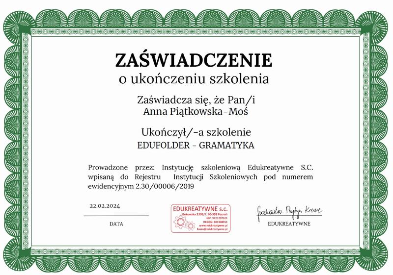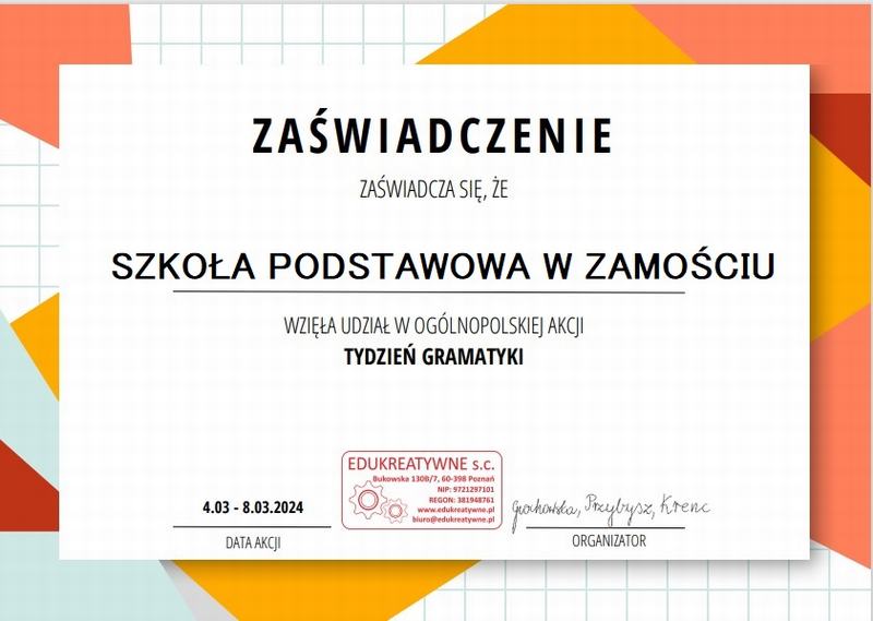 W dniach 4-8 marca uczniowie naszej szkoły wzięli udział w ogólnopolskiej akcji Tydzień Gramatyki z Edukreatywne. To coroczne święto ma na celu zwrócenie uwagi na znaczenie poprawnej i precyzyjnej komunikacji w języku pisanym i mówionym. Na lekcjach języka polskiego uczniowie klas IV – VIII pracowali metodą stacji zadaniowych, sprawdzali swoją koncentrację w gramatycznym teście na uważność, wykonali leporello na temat części mowy oraz mierzyli się z różnorodnymi zadaniami utrwalającymi wiedzę z gramatyki. Tydzień Gramatyki pokazał, że nauka nawet trudnych rzeczy może być przyjemna i ciekawa.
