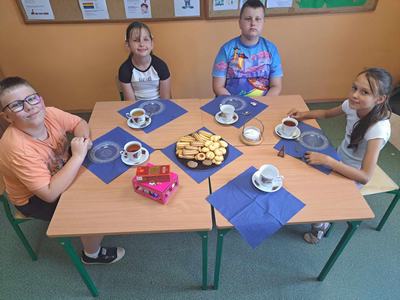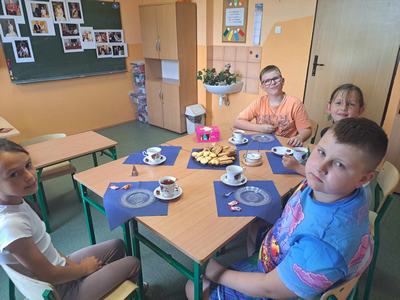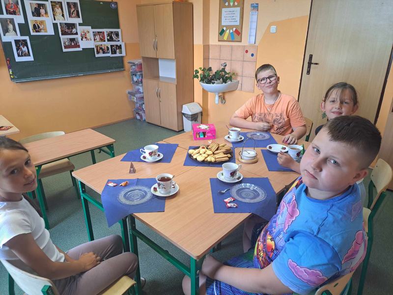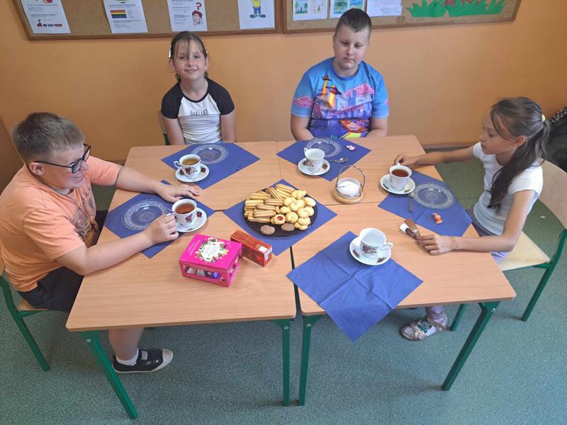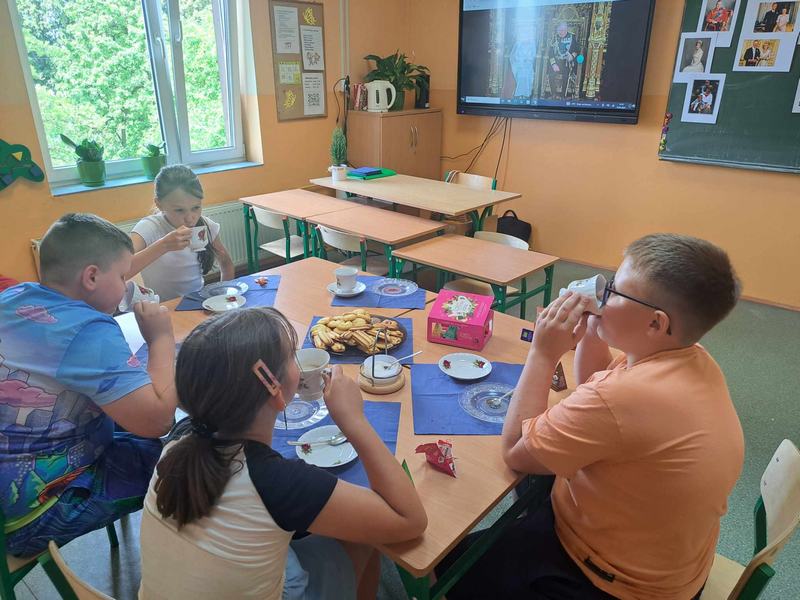Dnia 18 czerwca 2024 roku, w ramach realizacji Międzynarodowego Projektu Edukacyjnego „Z kulturą mi do twarzy”, podczas lekcji języka angielskiego uczniowie klasy IV zostali zaproszeni do degustacji angielskiej herbaty w stylu królewskim. Delektując się smakiem herbaty i kruchych ciasteczek obejrzeli kilka filmików o byłej królowej Anglii Elżbiecie II i obecnym królu Karolu III. Druga część zajęć poświęcona została ciekawostkom dotyczącym członkom Brytyjskiej Rodziny Królewskiej. Cała lekcja upłynęła w bardzo miłej i serdecznej atmosferze, a uczniowie wykazali się dużą wiedzą na temat rodziny królewskiej.