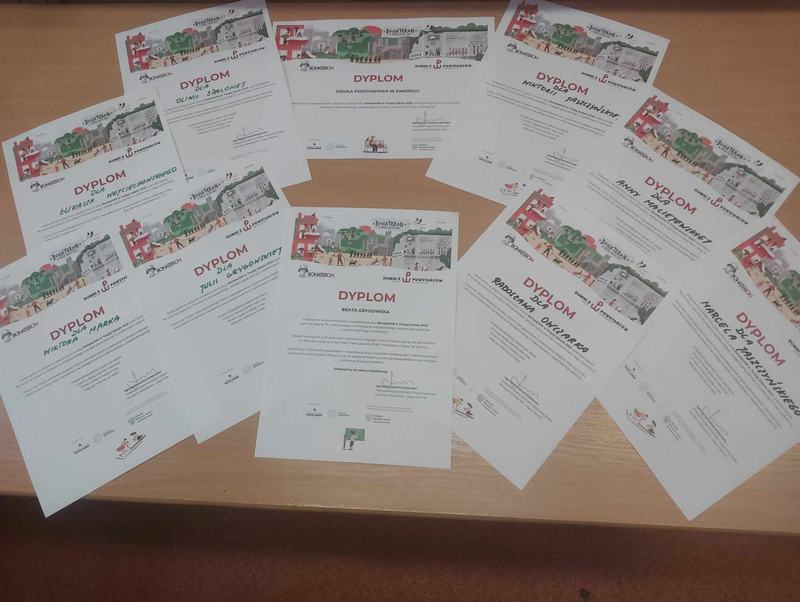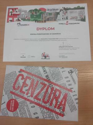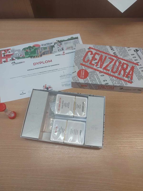 (2024-01-06) W listopadzie 2023r. uczniowie klasy VII i VIII wzięli udział w akcji „BohaterON. Włącz historię!”. Za uczestnictwo w projekcie otrzymaliśmy bezpłatny egzemplarz gry "Cenzura" zaktualizowanej o 100 nowych haseł z zakresu II wojny światowej oraz pamiątkowe dyplomy. Cieszymy się, że mogliśmy zaangażować się w lekcję współczesnego patriotyzmu. Dziękujemy!