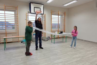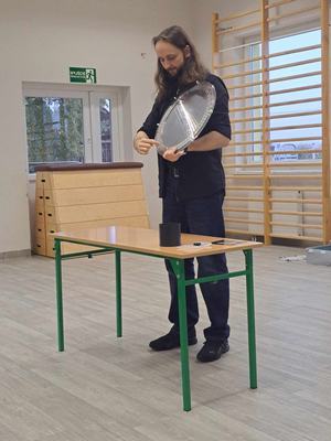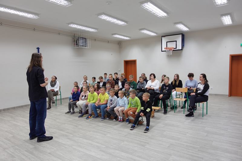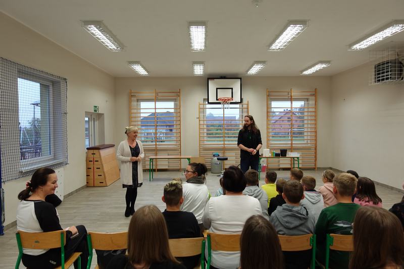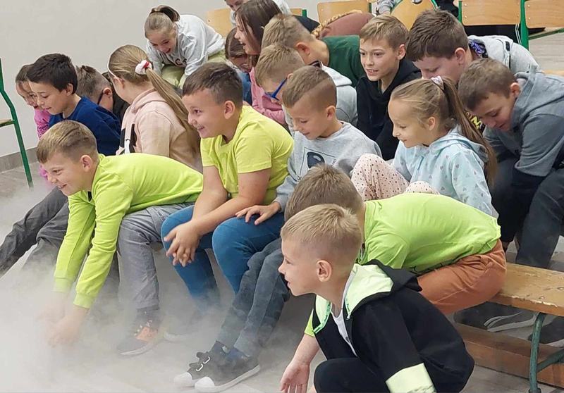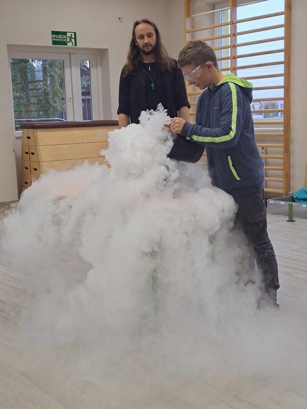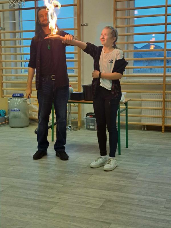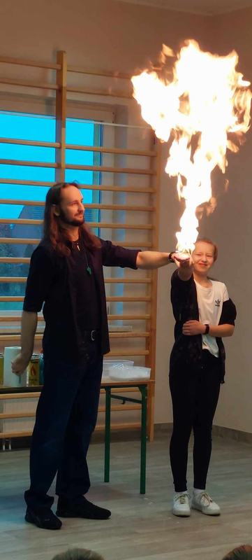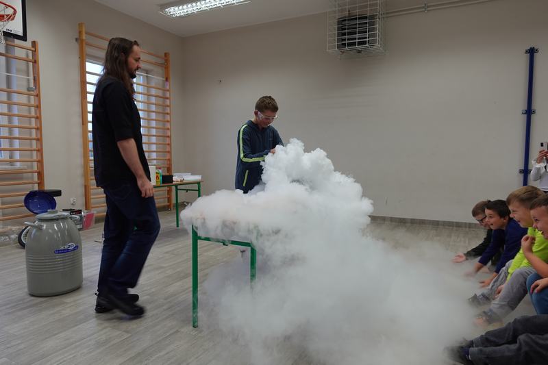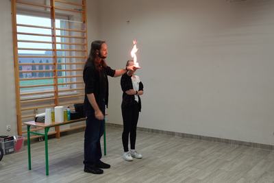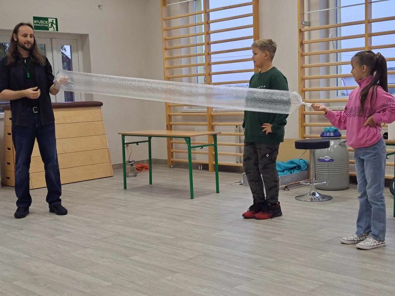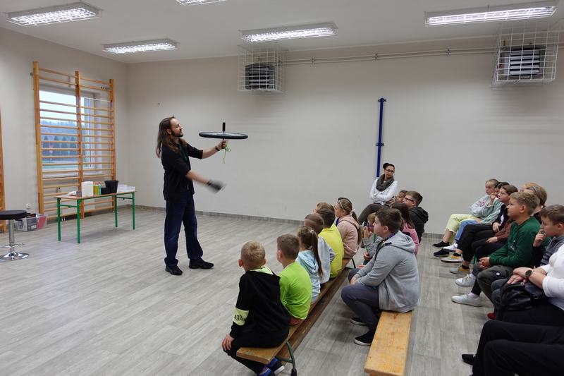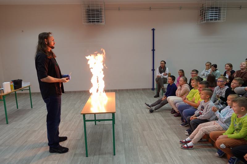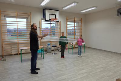 Pan Mateusz przedstawił interesującą lekcję prezentując różne ciekawe doświadczenia przyrodnicze, chemiczne i fizyczne. W prezentacji wzięli udział wszyscy uczniowie naszej szkoły. Podczas pokazu uczestnicy mogli dowiedzieć się w jaki sposób napompować dwumetrowy tunel foliowy w ciągu 3 sekund. Ciekawym doświadczeniem była zamiana gazowego butanu na ciecz i jednocześnie zaprezentowanie spalania otrzymanej substancji.