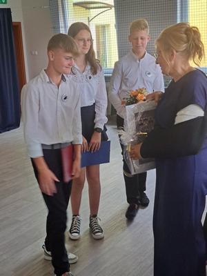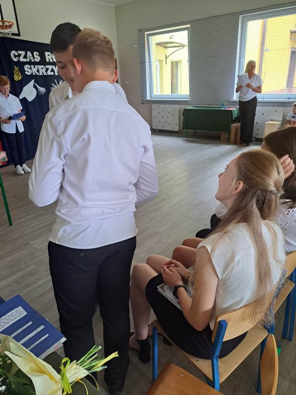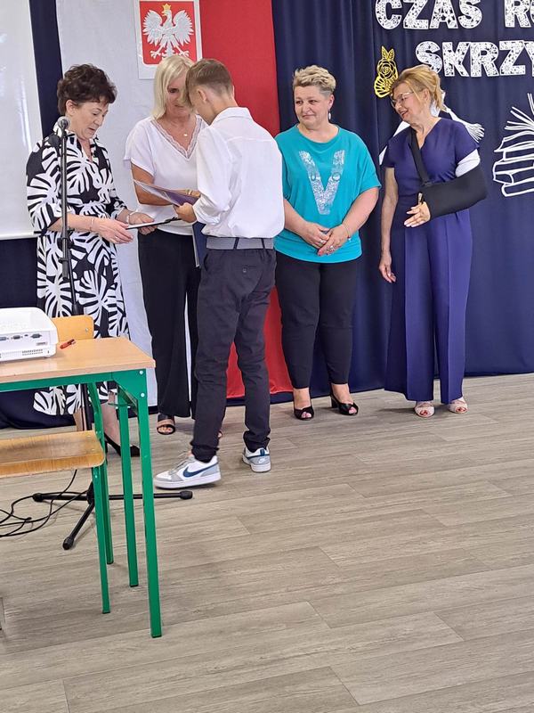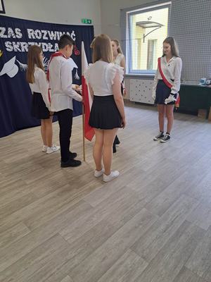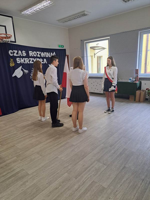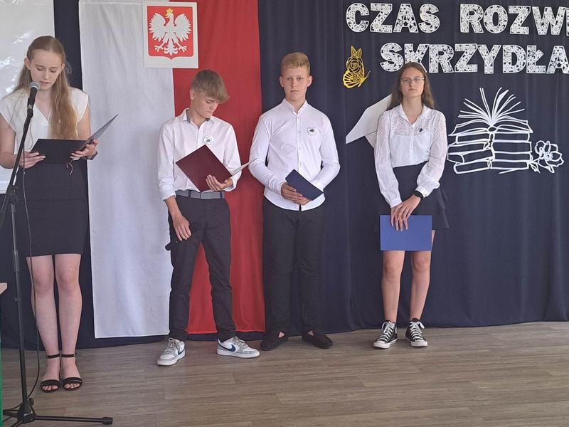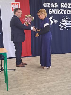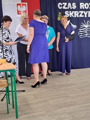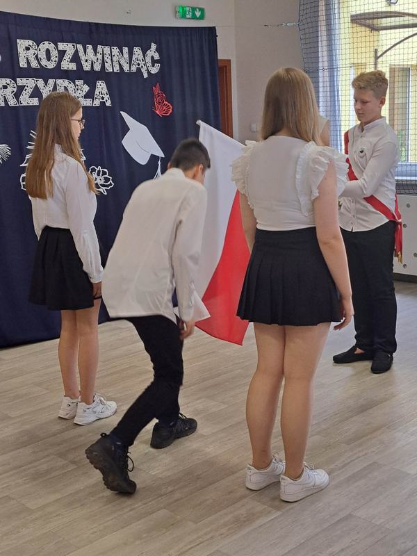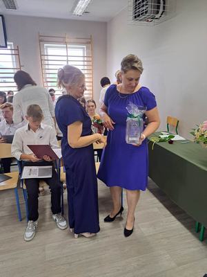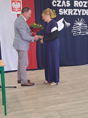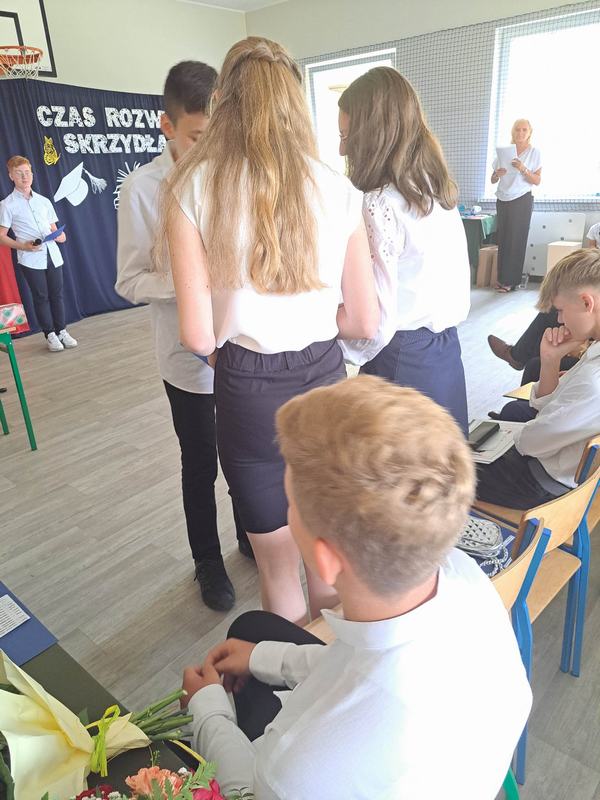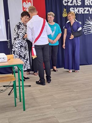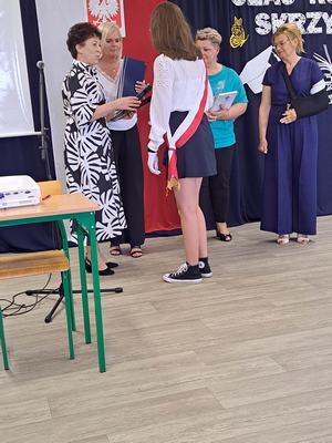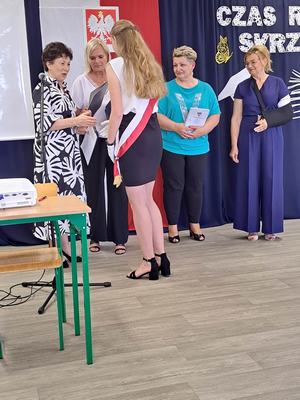 Pani Dyrektor Janina Siudzińska i przedstawiciel Rady Rodziców wręczyli wraz ze świadectwem ukończenia szkoły nagrody książkowe uczniom, którzy z wyróżnieniem ukończyli szkołę podstawową oraz listy gratulacyjne i dyplomy absolwenta. Następnie uczniom z pozostałych klas, którzy otrzymali świadectwa z wyróżnieniem wręczyli nagrody książkowe. Część oficjalną uroczystości zakończono przekazaniem flagi państwowej nowemu pocztowi flagowemu.