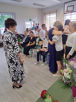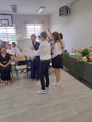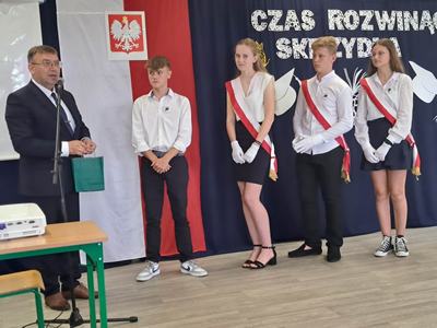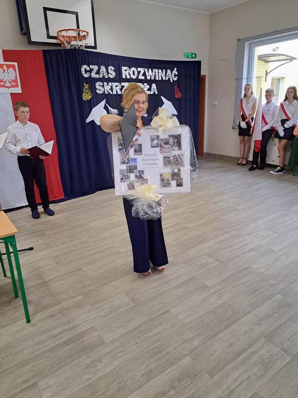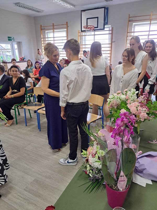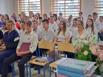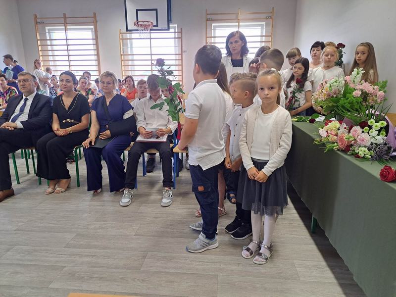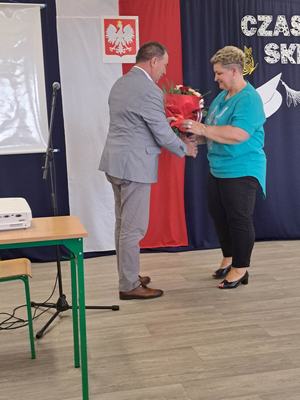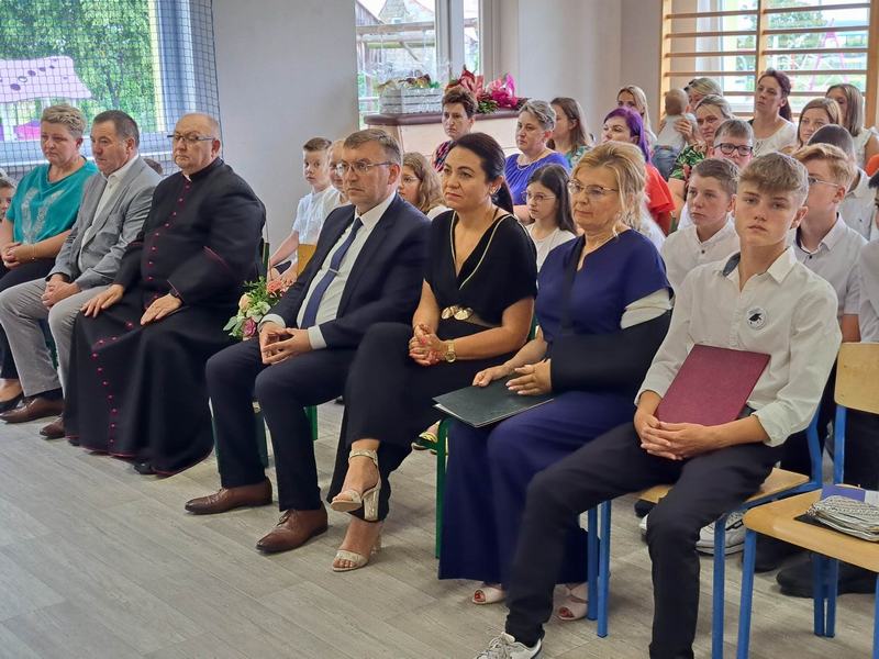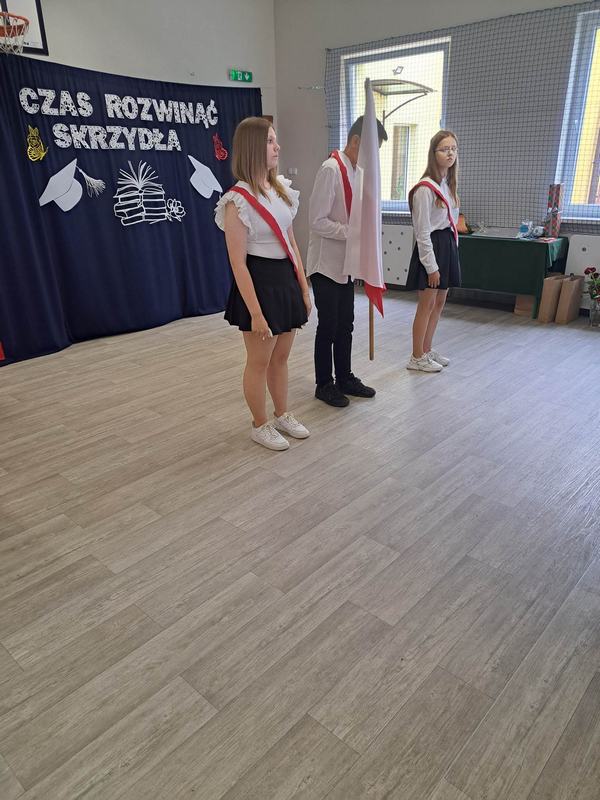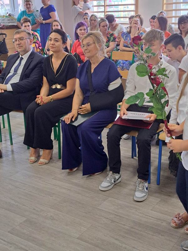 (2023-06-23) W piątek 23 czerwca 2023 roku, w Szkole Podstawowej w Zamościu odbyło się uroczyste zakończenie roku szkolnego 2022/2023 oraz pożegnanie tegorocznych absolwentów. Na uroczystości spotkali się uczniowie klas I – VIII oraz oddział przedszkolny. Pani Regina Zalejska w zastępstwie Pani Dyrektor Szkoły Janiny Siudzińskiej przywitała zebranych gości: Wójta Gminy Sieroszewice - Pana Anatola Piaskowskiego, Dyrektora Gminnego Zespołu Ekonomiczno-Administracyjnego Szkół – Panią Małgorzatę Olejnik, Proboszcza - Księdza Ryszarda Ryńca, Radnego Gminy Sieroszewice – Pana Tadeusza Zatylnego, Przewodniczącą Rady Rodziców - Panią Mariolę Panek, a także przedstawicieli Rady Rodziców, nauczycieli i pracowników szkoły, licznie przybyłych gości oraz uczniów. Uroczystość rozpoczęła się wprowadzeniem flagi państwowej i odśpiewaniem hymnu narodowego oraz hymnu szkoły.