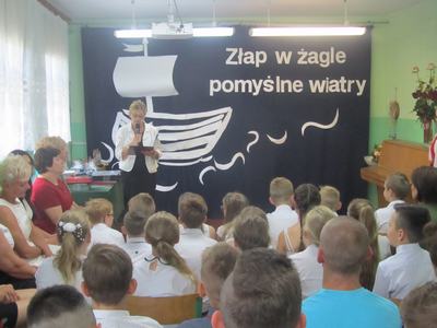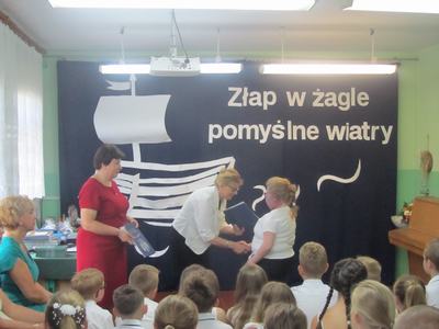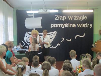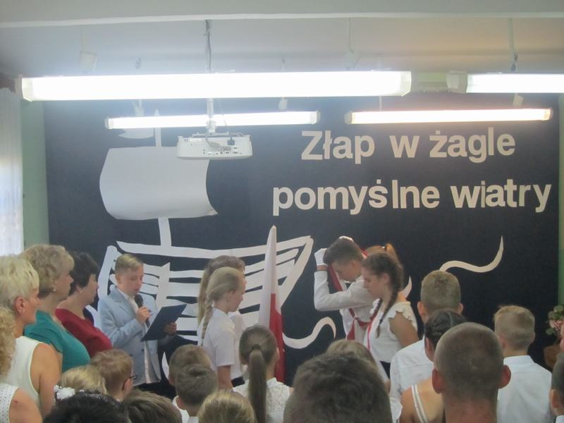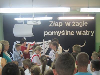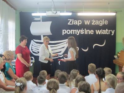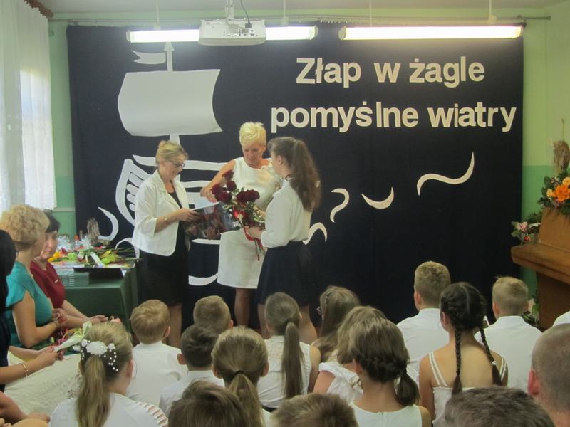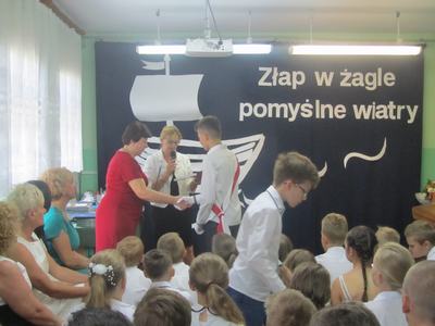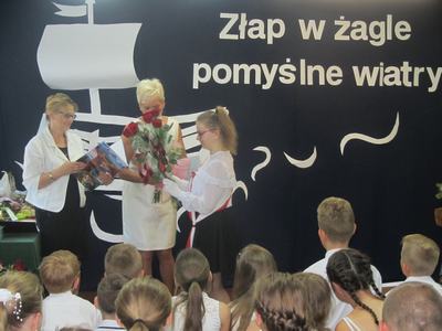 Końcowym wydarzeniem części oficjalnej było przekazanie flagi narodowej nowemu pocztowi flagowemu, który będzie się nią opiekował podczas uroczystości w kolejnym roku szkolnym. Uroczystość zakończył krótki występ artystyczny przygotowany przez uczniów klasy VIII pod hasłem: "Do zobaczenia w dorosłym życiu". Nie zabrakło też podziękowań skierowanych do wychowawcy, nauczycieli, dyrektora szkoły i rodziców za wsparcie w każdej sytuacji. Występ absolwentów dostarczył wzruszeń i wywołał wiele wspomnień. Koleżanki i kolegów kończących szkołę podstawową pożegnali uczniowie klas VI - VII przygotowanymi specjalnie dla nich muzycznymi dedykacjami i odznaczeniami oraz zaprosili ich na pożegnalnego torta. Teraz można planować wakacyjne wojaże! Życzymy wszystkim bezpiecznego i dobrze zaplanowanego wakacyjnego wypoczynku!