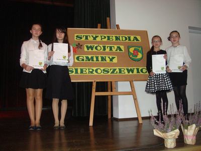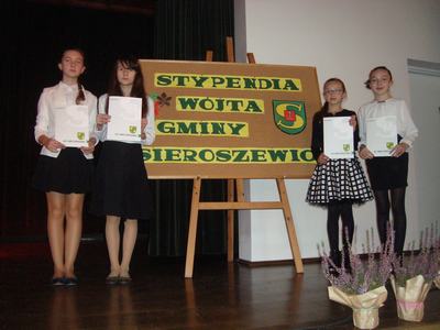 W czwartek, 27 października 2016 roku, w Gminnym Ośrodku Kultury w Sieroszewicach odbyła się gala wręczenia stypendiów dla uzdolnionych uczniów z gminy Sieroszewice. Stypendium Wójta Gminy Sieroszewice mógł uzyskać uczeń, który w roku szkolnym 2015/2016 w wyniku klasyfikacji rocznej uzyskał wzorową lub bardzo dobrą roczną ocenę zachowania i osiągnął średnią rocznych ocen klasyfikacyjnych co najmniej 5,30. W naszej szkole takie wymagania spełniły cztery uczennice: Aleksandra Moś, Marika Pilarczyk, Agnieszka Stempin i Natalia Zatylna. Zostały one zaproszone na galę i odebrały stypendia z rąk wójta Czesława Berkowskiego i przewodniczącego Rady Gminy Sieroszewice Pawła Siwaka. Wszystkim nagrodzonym uczniom wójt gminy Sieroszewice pogratulował bardzo dobrych wyników w nauczaniu, życzył, aby następne lata edukacji były owocne jak ten rok oraz wyraził nadzieję na spotkanie w przyszłym roku.