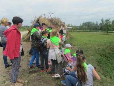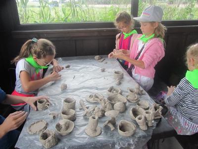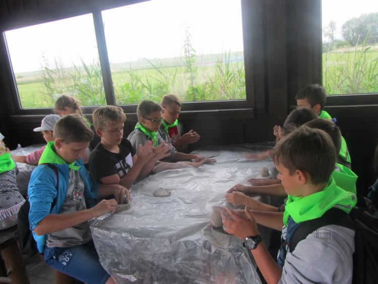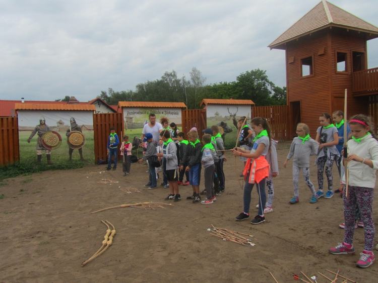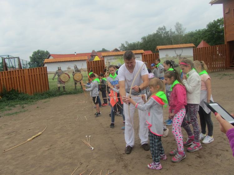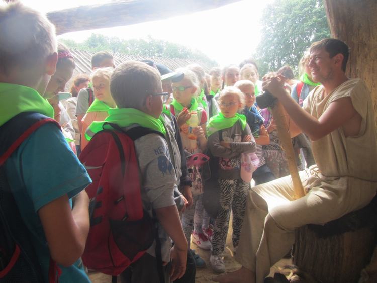 Wizytę w Biskupinie rozpoczęliśmy od warsztatów lepienia z gliny oraz strzelania z łuku i kuszy. Następnie udaliśmy się do muzeum, gdzie oglądaliśmy makiety, obrazy, ekspozycje i przedmioty codziennego użytku. Rozpoznawaliśmy przeznaczenie prymitywnych narzędzi rolniczych, broni, tkanin, ubiorów i glinianych naczyń. Dziewczynkom bardzo podobały się ozdoby noszone przez biskupińskie kobiety, zwłaszcza bransolety i naszyjniki. Szczególne poruszenie wzbudziły obrzędy pogrzebowe mieszkańców Biskupina, a przede wszystkim palenie zmarłych na stosie i zbieranie spopielonych szczątków do urn.