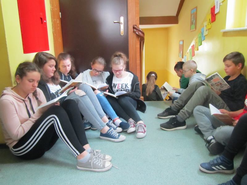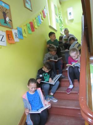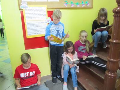 Biblioteka Pedagogiczna Wojewódzkiego Ośrodka Metodycznego w Gorzowie Wielkopolskim zaprosiła uczniów i nauczycieli do wzięcia udziału w ogólnopolskiej akcji bicia rekordu w liczbie osób czytających na przerwie pod hasłem "Przerwa na czytanie". Wydarzenie to odbyło się w ramach XVI Ogólnopolskiego Tygodnia Bibliotek ph. #biblioteka. Celem akcji jest: promocja czytelnictwa wśród dzieci i młodzieży, integracja środowiska lokalnego, pokazanie uczniom, że czytanie jest ciekawe, wzmocnienie współpracy szkół polskich z zagranicznymi, zachęcenie do sięgania po książkę w każdej sytuacji i każdym miejscu. W wtorek 14 maja 2019 roku przedszkolaki i uczniowie naszej szkoły przyłączyli się do ogólnopolskiej akcji bicia rekordu w liczbie osób czytających na przerwie. Do wzięcia udziału w przedsięwzięciu zachęcali koleżanki i kolegów przedstawiciele samorządu uczniowskiego, którzy odwiedzali poszczególne klasy z zaproszeniami do wspólnego czytania. Ponadto na szkolnym korytarzu umieszczono plakat promujący "Przerwę na czytanie". Na czytanie wyznaczono dwie przerwy, w czasie których dzieci i nauczyciele oddali się lekturze w wybranym przez siebie miejscu: na schodach, korytarzu, w klasach. W oddziale przedszkolnym do akcji włączyli się rodzice, pani Anna Jeziorna czytała dzieciom ulubione baśnie. Łącznie w akcji bicia rekordu czytania na przerwie wzięło udział 40 uczniów oraz 20 przedszkolaków. Na zakończenie każdy czytający otrzymał zakładkę do książki. Nad organizacją "Przerwy na czytanie" w szkole czuwała nauczycielka języka polskiego Anna Piątkowska - Moś. Akcja okazała się doskonałym pomysłem promującym czytelnictwo i udowodniła, że czytać można wszędzie, o każdej porze, a najprzyjemniej w towarzystwie koleżanek i kolegów.