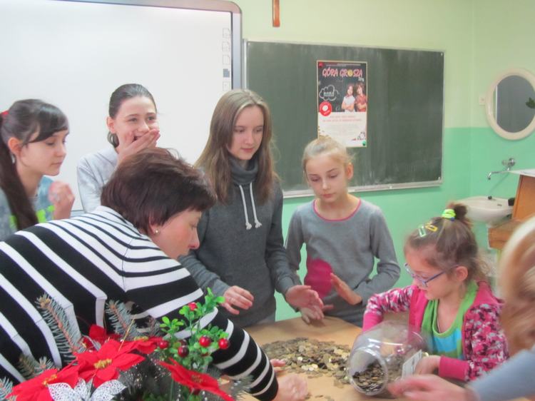 Z zebranych monet została usypana "Szkolna Góra Grosza". Klasom, którym udało zebrać się największą kwotę, wręczono dyplomy i nagrody.