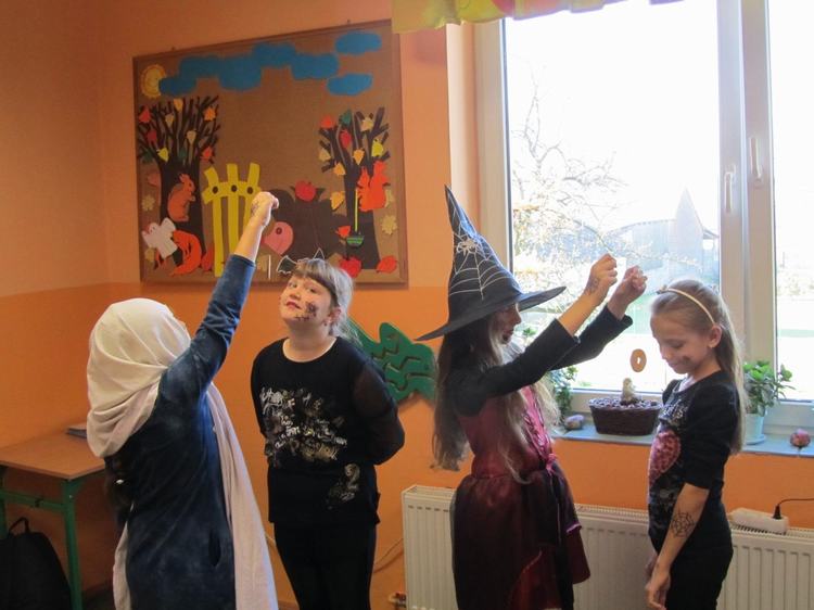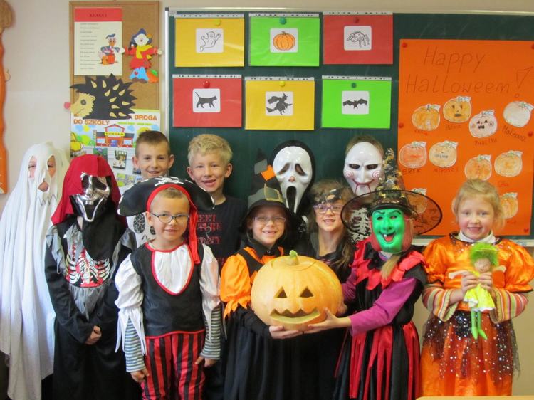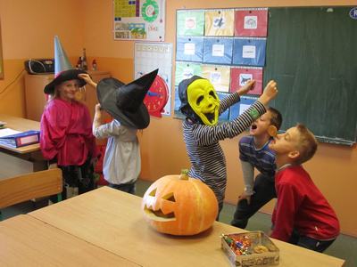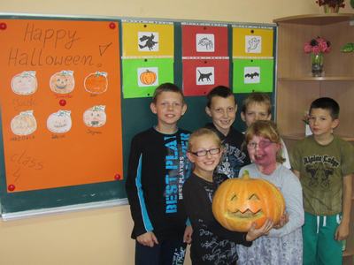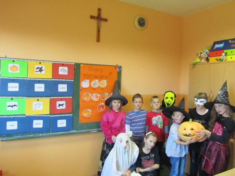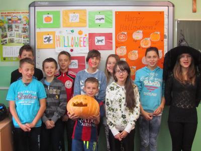 W ostatnim tygodniu października na lekcjach języka angielskiego uczniowie klas I - VI świętowali Halloween. Uczniowie wcielili się w postaci duchów, czarownic i potworów. W blasku lampionów z dyń dzieci poznały historię i zwyczaje związane z tym świętem. Ponadto uczestniczyli w różnych konkursach, w których na zwycięzców czekały słodkie nagrody. Uczniowie zmierzyli się konkurencjach takich jak: zjadanie ciasteczka ze sznurka bez użycia rąk, czy też przechodzenie przez zaczarowane bagno. Pod koniec zabawy wszyscy uczestnicy wykonali z papieru lampiony z dyni i stworzyli wspólny plakat.