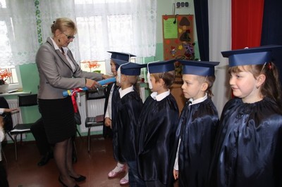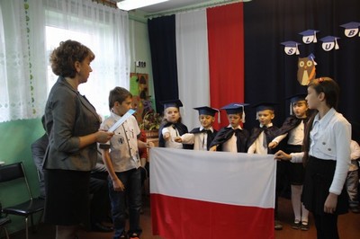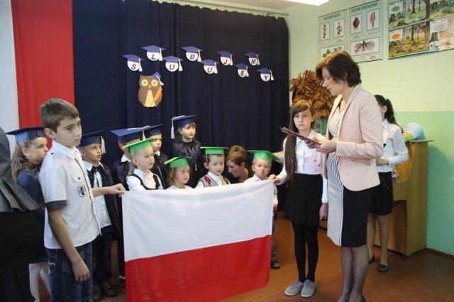 Po wypowiedzeniu przyrzeczenia i ślubowaniu na sztandar dyrektor szkoły Janina Siudzińska dokonała aktu pasowania na ucznia i przedszkolaka.