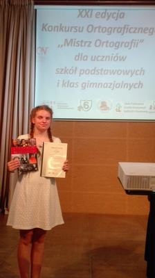 Uczniowie w pierwszym etapie pisali dyktando, w kolejnej części rozwiązywali test ortograficzno - interpunkcyjny i wreszcie w ostatnim etapie finaliści pisali dyktando. Naszą szkołę w konkursie reprezentowała uczennica klasy VI, Julia Spalona, która została finalistką ostatniego etapu i otrzymała nagrodę z rąk profesora Andrzeja Markowskiego - znanego i ceniony językoznawcy, autora słowników ortograficznych i słowników poprawnej polszczyzny, przewodniczącego Rady Języka Polskiego w Warszawie.