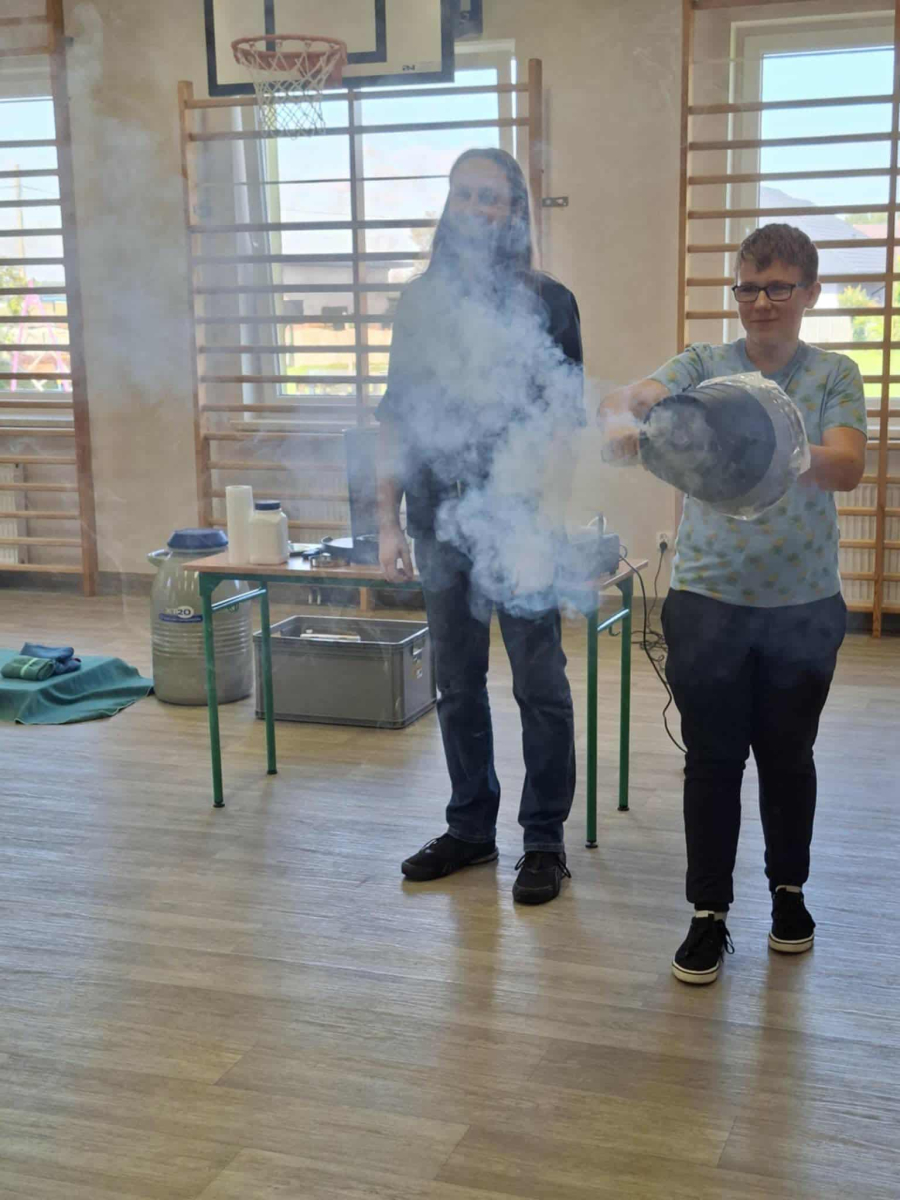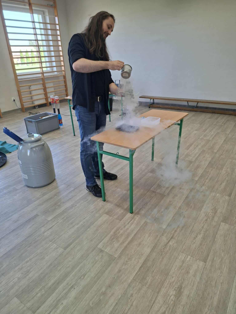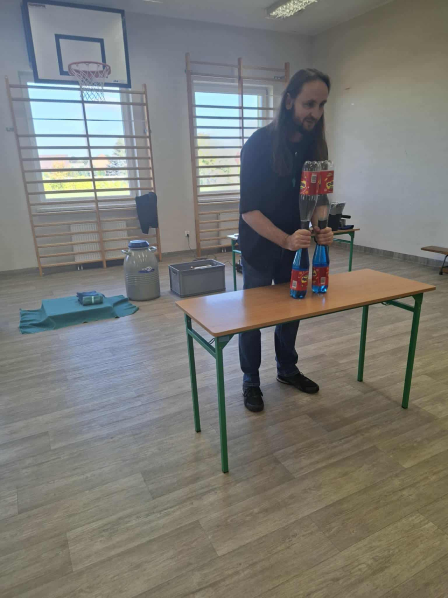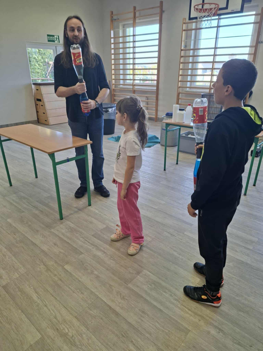 Każdy eksperyment poprzedzony był krótkim wprowadzeniem i szczegółowym objaśnieniem zasad bezpieczeństwa. Pan Łucki nie tylko prezentował doświadczenia, ale również w przystępny sposób tłumaczył prawa fizyki i zjawiska przyrodnicze, które za nimi stoją. Dzięki temu uczniowie mogli przekonać się, że nauka to nie tylko wzory i definicje, ale także fascynująca przygoda pełna odkryć.