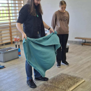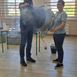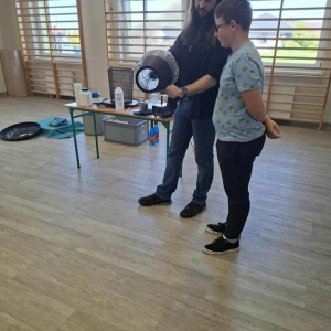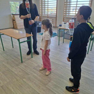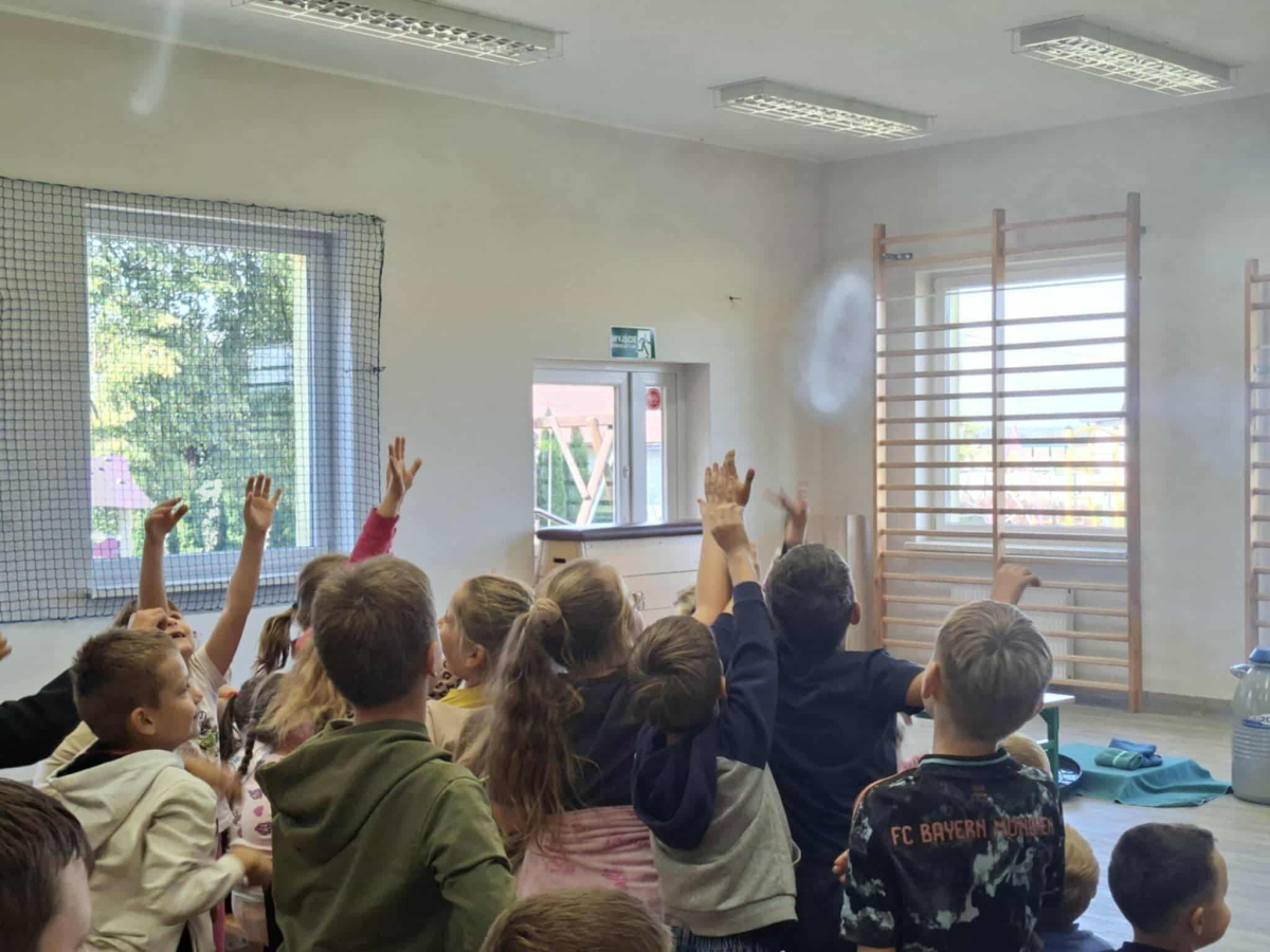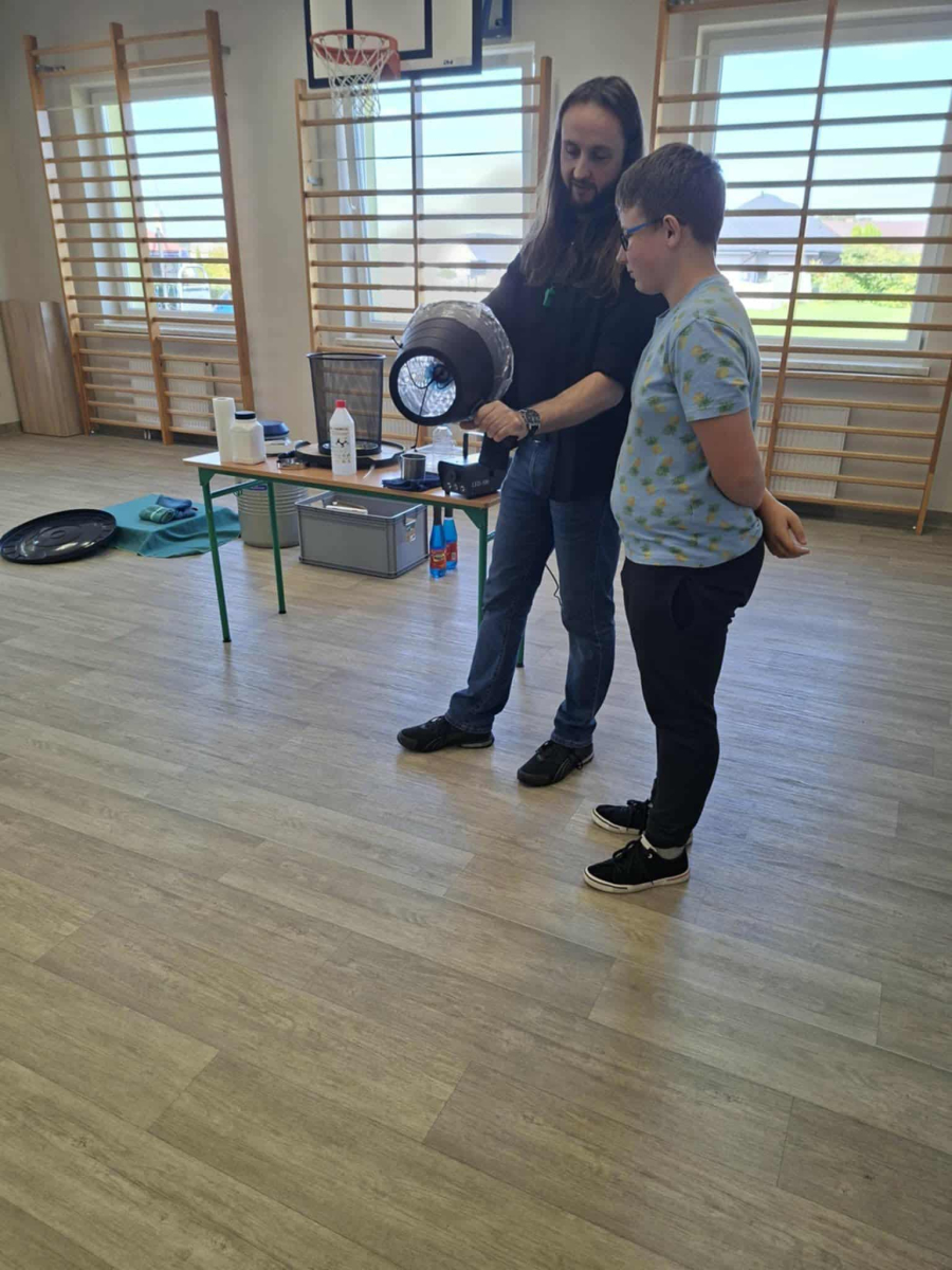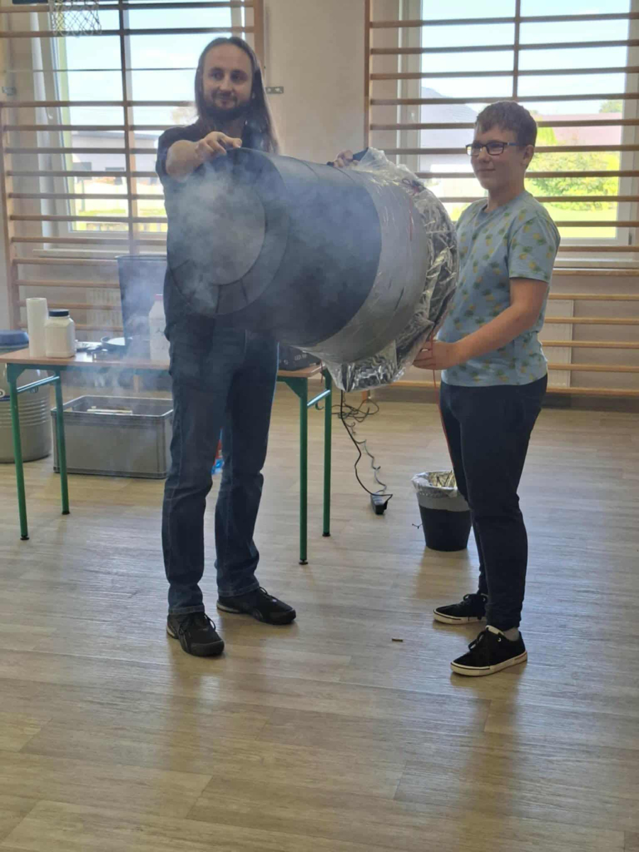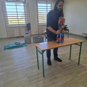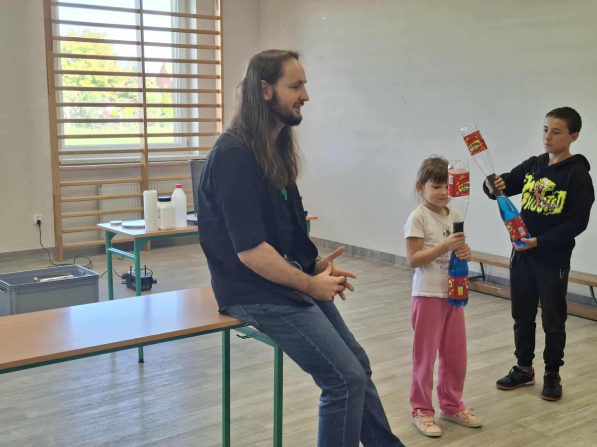 Każdy eksperyment poprzedzony był krótkim wprowadzeniem i szczegółowym objaśnieniem zasad bezpieczeństwa. Pan Łucki nie tylko prezentował doświadczenia, ale również w przystępny sposób tłumaczył prawa fizyki i zjawiska przyrodnicze, które za nimi stoją. Dzięki temu uczniowie mogli przekonać się, że nauka to nie tylko wzory i definicje, ale także fascynująca przygoda pełna odkryć.