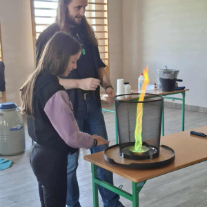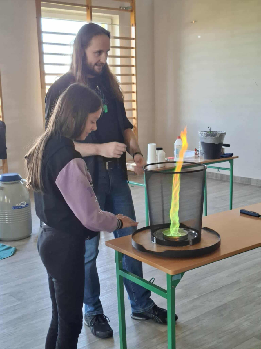 • ogniste tornado i zmianę barwy płomienia, czyli pokaz z pogranicza chemii i fizyki, który rozpalił wyobraźnię uczniów,