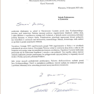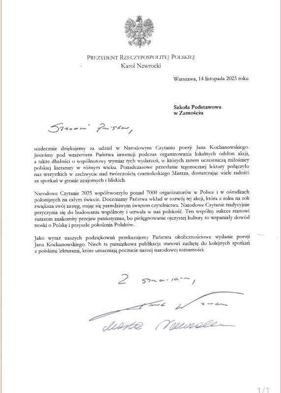 Z radością informujemy, że nasza szkoła otrzymała oficjalne podziękowanie za udział w tegorocznej edycji Narodowego Czytania. Wyróżnienie to stanowi wyraz uznania dla całej społeczności szkolnej w promocję czytelnictwa i popularyzację polskiej literatury. Uczestnictwo naszej szkoły w ogólnopolskiej akcji jest ważnym elementem kształtowania wrażliwości literackiej, rozwijania kompetencji czytelniczych oraz budowania wspólnoty czytających. Cieszymy się, że nasza inicjatywa została zauważona i doceniona. Dziękujemy wszystkim, którzy włączyli się w przygotowanie i realizację tego wydarzenia.